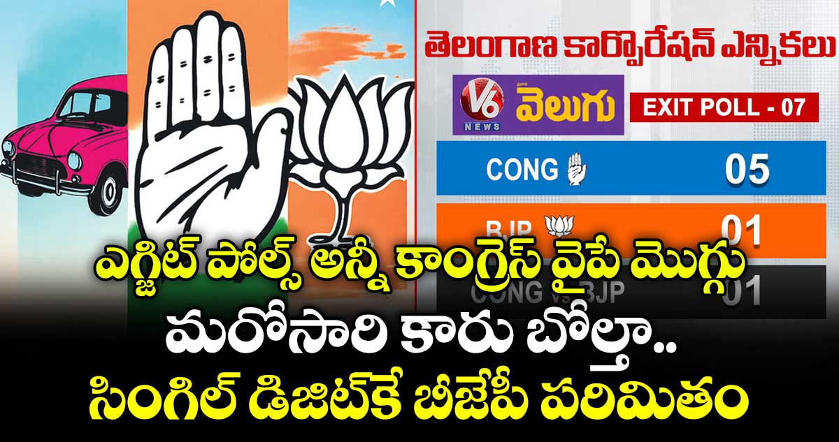 హైదరాబాద్: మున్సిపోల్స్ ముగిసిన వెంటనే వెలువడిన ఎగ్జిట్ పోల్స్ ఫలితాలు అధికార కాంగ్రెస్ పార్టీకే పట్టం కట్టాయి. ప్రధానంగా 'వీ6 -వెలుగు' ఎగ్జిట్ పోల్స్ సర్వే ప్రకారం.. రాష్ట్రంలోని మొత్తం 116 మున్సిపాలిటీలలో కాంగ్రెస్ ఏకపక్ష విజయం సాధించే దిశగా వెళ్తోంది. ఆ పార్టీకి ఏకంగా 85 నుంచి 95 మున్సిపాలిటీలు దక్కుతాయని అంచనా వేయగా.. బీఆర్ఎస్ 15 నుంచి 20 స్థానాలకు, బీజేపీ 2 నుంచి 5 స్థానాలకు పరిమితమయ్యే అవకాశాలున్నాయి. ఇక ఎంఐఎం 2 చోట్ల గెలిచే చాన్స్ ఉంది.