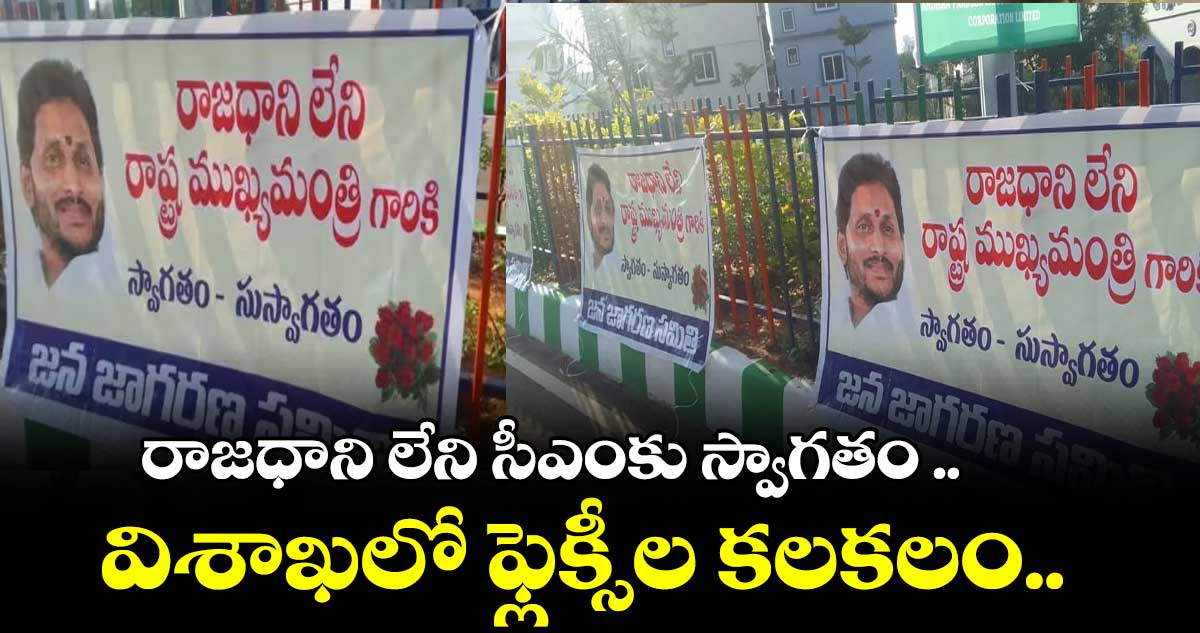 ముఖ్యమంత్రి వైఎస్ జగన్మోహన్ రెడ్డి మే 3న విశాఖ జిల్లాలో పర్యటించనున్నారు. ఈ క్రమంలో వైసీపీ ప్రభుత్వ మూడు రాజధానుల నిర్ణయంతో ఏపీ రాజధాని లేని రాష్ట్రంగా మారిందంటూ జన జాగరణ సమితి వినూత్నంగా నిరసన తెలిపేందుకు సిద్దమయ్యింది. వైసిపి ఎంపీ ఎంవివి సత్యనారాయణ ఇంటికి సీఎం జగన్ వెళ్ళే అవకాశాలుండటంతో ఆ దారిలో రాజధాని లేని రాష్ట్ర ముఖ్యమంత్రి జగన్ కు స్వాగతం అంటూ ప్లెక్సీలు ఏర్పాటుచేసారు. ఇలా విశాఖలో జన జాగరణ సమితి సీఎం జగన్ పై సెటైర్లు విసురుతూ ఏర్పాటుచేసిన ప్లెక్సీలు దుమారం రేపుతున్నాయి.