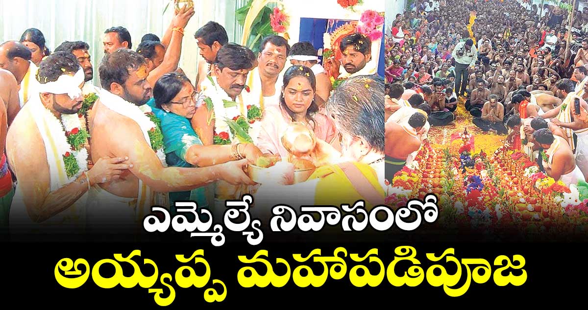 నకిరేకల్, వెలుగు: అయ్యప్ప స్వామి ఎక్కడో ఉండరని, మాలధారణ చేసిన ప్రతి వ్యక్తిలోనూ ఉంటారని ఎమ్మెల్యే వేముల వీరేశం అన్నారు. ఆదివారం ఎమ్మెల్యే వేముల వీరేశం పుష్ప దంపతుల ఆధ్వర్యంలో నకిరేకల్లోని వారి స్వగృహంలో అయ్యప్ప స్వామి నాలుగవ మహాపడిపూజ అంగరంగ వైభవంగా నిర్వహించారు. ఈ సందర్భంగా ఎమ్మెల్యే మాట్లాడుతూ.. వచ్చే ఏడాది నుంచి నకిరేకల్లో అయ్యప్ప స్వాములకు భిక్ష, అల్పాహారం ఏర్పాటు చేస్తామని హామీ ఇచ్చారు. ఎమ్మెల్యే కుటుంబ సభ్యులతో కలిసి అభిషేకాలు, పంచామృతాభిషేకం, పుష్పాభిషేకం తదితర ప్రత్యేక పూజలు నిర్వహించారు.