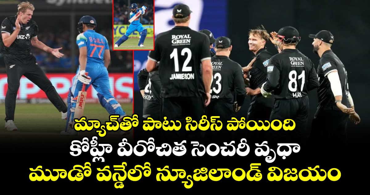 న్యూజిలాండ్ తో జరిగిన మూడో వన్డేలో టీమిండియా ఓడిపోయింది. ఆదివారం (జనవరి 18) ఇండోర్ వేదికగా హోల్కర్ క్రికెట్ స్టేడియంలో ముగిసిన ఈ మ్యాచ్ లో 41 పరుగుల తేడాతో పరాజయం పాలైంది. ఫలితంగా మ్యాచ్ తో పాటు 1-2 తేడాతో సిరీస్ కూడా ఇండియా చేజార్చుకుంది. 338 పరుగుల ఛేజింగ్ లో కోహ్లీ వీరోచిత సెంచరీ (124) చేసి పోరాడినా ఫలితం లేదు. మరోవైపు బ్యాటింగ్, బౌలింగ్ విభాగాల్లో అదరగొట్టిన న్యూజిలాండ్ అద్భుతమైన విజయాన్ని సొంతం చేసుకొని మూడు మ్యాచ్ ల వన్డే సిరీస్ ను 2-1 తేడాతో గెలుచుకుంది. మొదట బ్యాటింగ్ చేసిన న్యూజిలాండ్ నిర్ణీత 50 ఓవర్లలో 8 వికెట్ల నష్టానికి 337 పరుగులు చేసింది. ఛేజింగ్ లో ఇండియా 46 ఓవర్లలో 296 పరుగులకు ఆలౌటైంది.