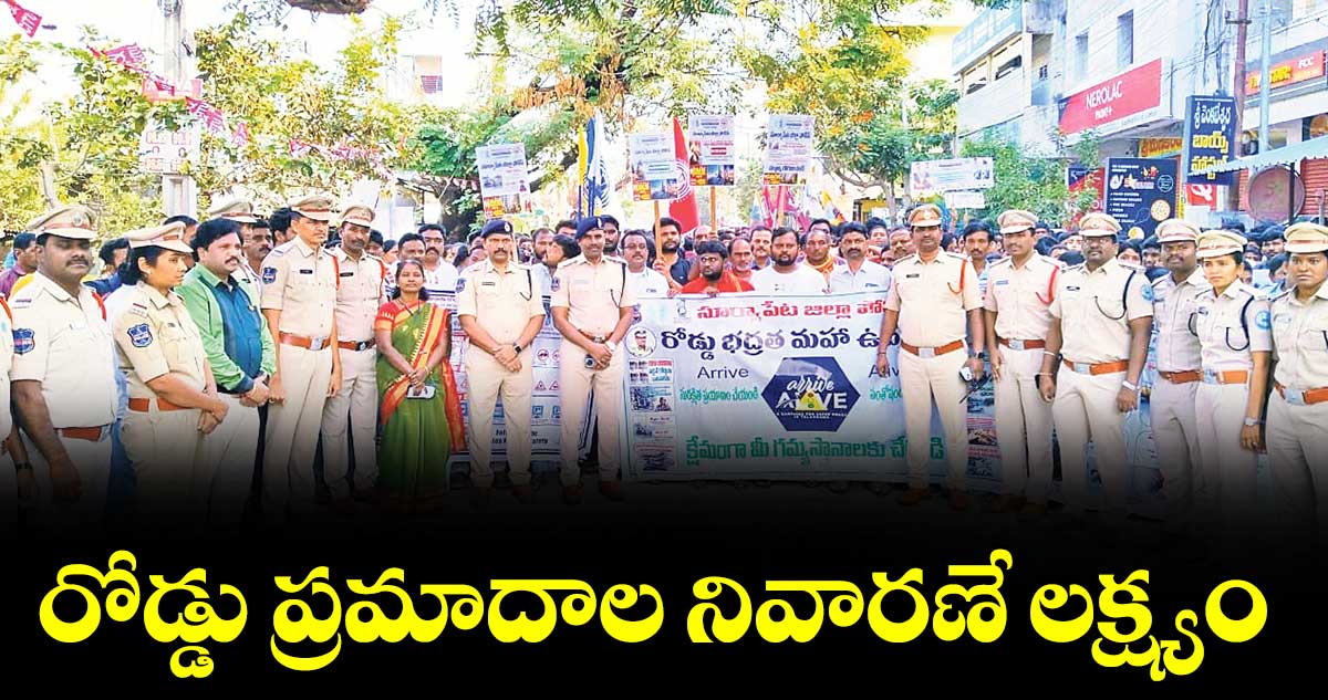 సూర్యాపేట, వెలుగు: రోడ్డు ప్రమాదాల నివారణ ప్రతి ఒక్కరి లక్ష్యం కావాలని ఎస్పీ నరసింహ అన్నారు. ‘అరైవ్ అలైవ్’ రోడ్డు భద్రతా మాసోత్సవాల్లో భాగంగా సూర్యాపేట జిల్లా కేంద్రంలో పట్టణ, ట్రాఫిక్ పోలీసుల ఆధ్వర్యంలో గురువారం విద్యార్థులు, డ్రైవర్లు, యువతతో కలిసి భారీ ర్యాలీ నిర్వహించారు. ఈ ర్యాలీని ఎస్పీ నరసింహ ప్రారంభించారు. అనంతరం ఆయన మాట్లాడుతూ.. రోడ్డు భద్రతా, ప్రమాదాల నివారణ కోసం విద్యార్థులు భాగస్వామ్యం కావాలని పిలుపునిచ్చారు.