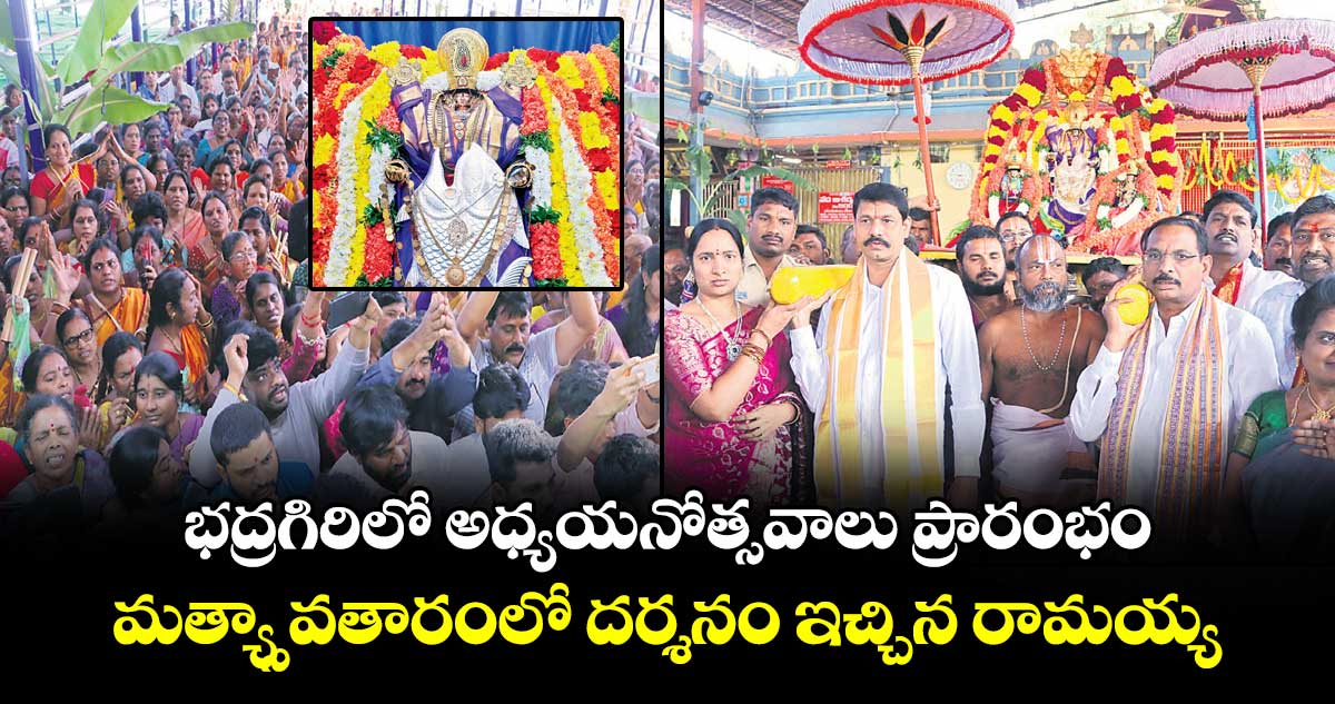 అధ్యయనోత్సవాల్లో భాగంగా చతుర్వేద పారాయణాలు , రామాయణ పారాయణం చేసే రుత్విక్కులకు, వేదపండితులకు దీక్షా వస్త్రాలను ఈవో దామోదర్రావు అందజేశారు. తర్వాత ప్రత్యేక ఆరాధనలో ముందుగా వేదాలు, ఇతిహాసాలు, పురాణం, భద్రాద్రి క్షేత్ర మహత్యం, దివ్యప్రబంధంతో అధ్యయాన్ని ప్రారంభించారు. దీనినే సంప్రదాయబద్ధంగా తొళక్కం అంటారు. గంటపాటు నాళాయర దివ్యప్రబంధంలోని పద్యాలను సేవాకాలం చేశారు. తర్వాత కోలాటాలు,రామనామ స్మరణలతో మత్స్యవతార రామయ్యను ఊరేగింపుగా ఆలయం నుంచి వైకుంఠ ద్వారం ఎదురుగా ఏర్పాటు చేసిన వేదికపైకి తీసుకొచ్చారు. భక్తులు స్వామిని దర్శించుకుని పులకించారు. తీర్ధప్రసాదాలు స్వీకరించారు.