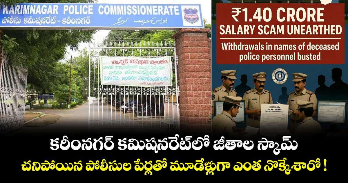 కరీంనగర్ పోలీస్ కమిషనరేట్లో జీతాల స్కామ్ కలకలం రేపింది. చనిపోయిన పోలీసుల పేర్లపైన కోట్లలో జీతాలు విత్ డ్రా చేసిన వైనం పోలీసు శాఖలో చర్చనీయాంశంగా మారింది. గత కొంతకాలంగా ఈ స్కామ్ గురించి సీక్రెట్ గా దర్యాప్తు చేస్తున్న ఉన్నతాధికారులు.. గురువారం (2026 ఏప్రిల్ 09) వివరాలు బయటపెట్టారు.