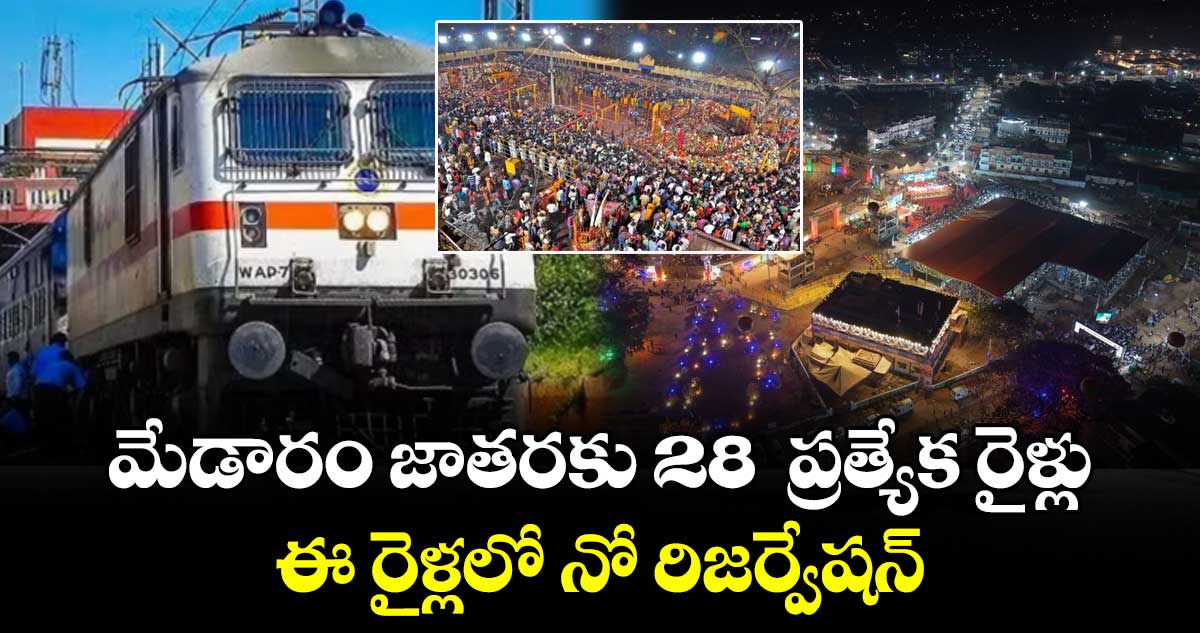 హైదరాబాద్ సిటీ, వెలుగు: ఈ నెల 28 నుంచి ప్రారంభమయ్యే మేడారం జాతరకు వెళ్లే భక్తుల కోసం దక్షిణ మధ్య రైల్వే 28 ప్రత్యేక రైళ్లను నడపనున్నది. ఈ రైళ్లలో రిజర్వేషన్ ఉండదని అధికారులు తెలిపారు. ఈ నెల 28 నుంచి 30 వరకు సికింద్రాబాద్, మంచిర్యాల మీదుగా 3 సర్వీసులు, మంచిర్యాల–సికింద్రాబాద్ మధ్య మరో 3, సికింద్రాబాద్– సిర్పూర్కాగజ్నగర్కు 2, సిర్పూర్ కాగజ్ నగర్– సికింద్రాబాద్కు 2, నిజామాబాద్–వరంగల్మధ్య 4, వరంగల్–నిజామాబాద్ మధ్య 4, కాజీపేట–ఖమ్మం మధ్య 4, ఖమ్మం – కాజీపేట మధ్య 4, ఆదిలాబాద్–కాజీపేట మధ్య 1, కాజీపేట – ఆదిలాబాద్మధ్య ఒక సర్వీసు నడపనున్నట్టు అధికారులు తెలిపారు.