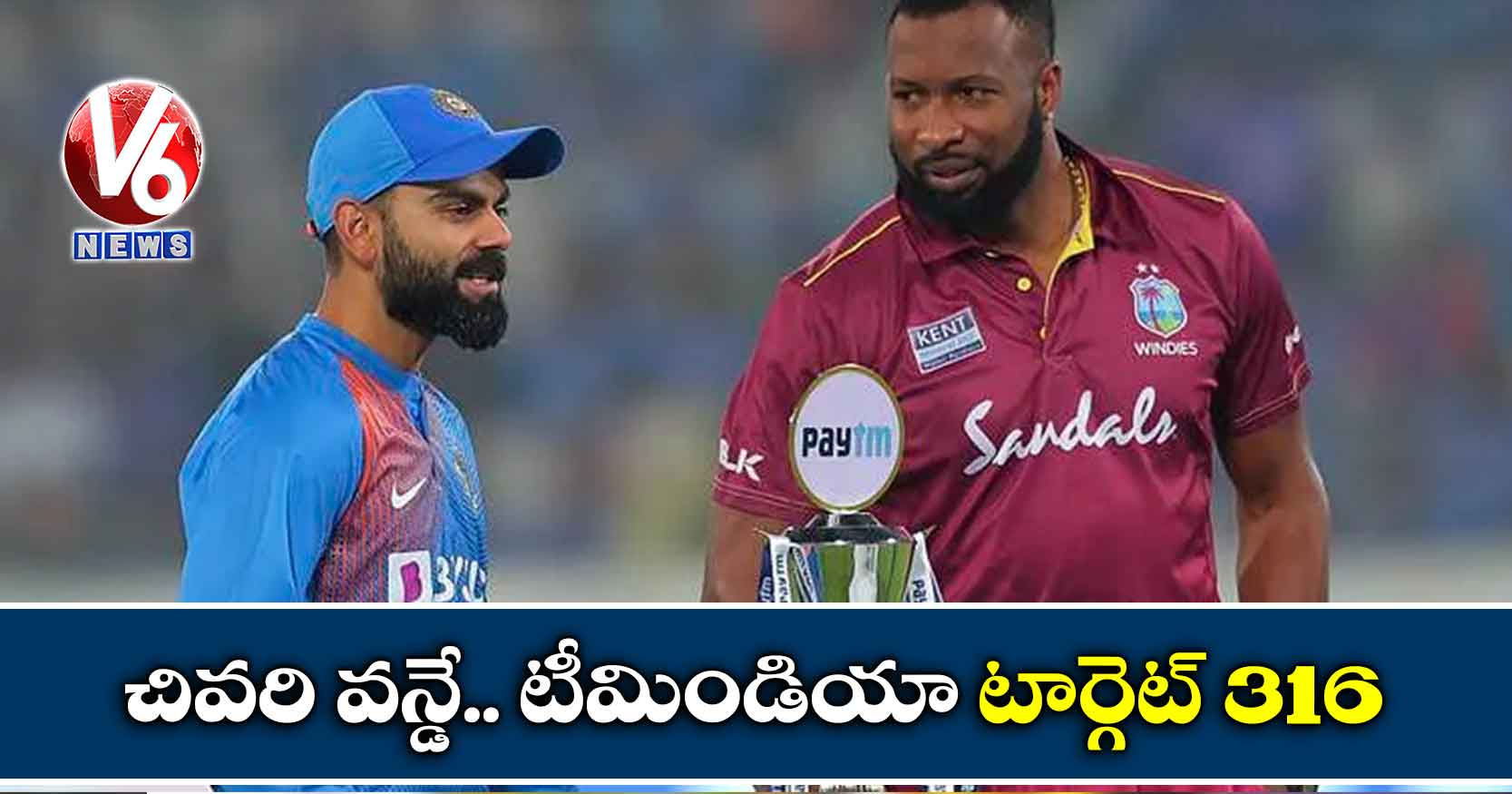 కటక్ లో భారత్ వర్సెస్ వెస్టిండీస్ జట్ల మధ్య జరుగుతున్న చివరి వన్డే మ్యాచ్ లో వెస్టిండీస్ జట్టు నిర్ణీత 50 ఓవర్లలో 315 పరుగులు చేసింది. టీమిండియా మొదట టాస్ గెలిచి ఫీల్డింగ్ ఎంచుకోవడంతో వెస్టిండీస్ బ్యాటింగ్ చేపట్టింది. భారత్ జట్టు విజయలక్ష్యాన్ని చేరుకోవాలంటే 316 పరుగులు చేయాల్సి ఉంది. వెస్టిండీస్ బ్యాట్స్ మెన్లు పూరన్ 89, పోలార్డ్ 74, హోప్ 42, ఛేజ్ 38, హెట్మెయిర్ 37, లూయిస్ 21 పరుగులు చేశారు. భారత్ బౌలర్లు నవదీప్ షైనీ 2, షమీ, శార్దూల్, రవీంద్ర జడేజాలు తలో వికెట్ తీశారు.