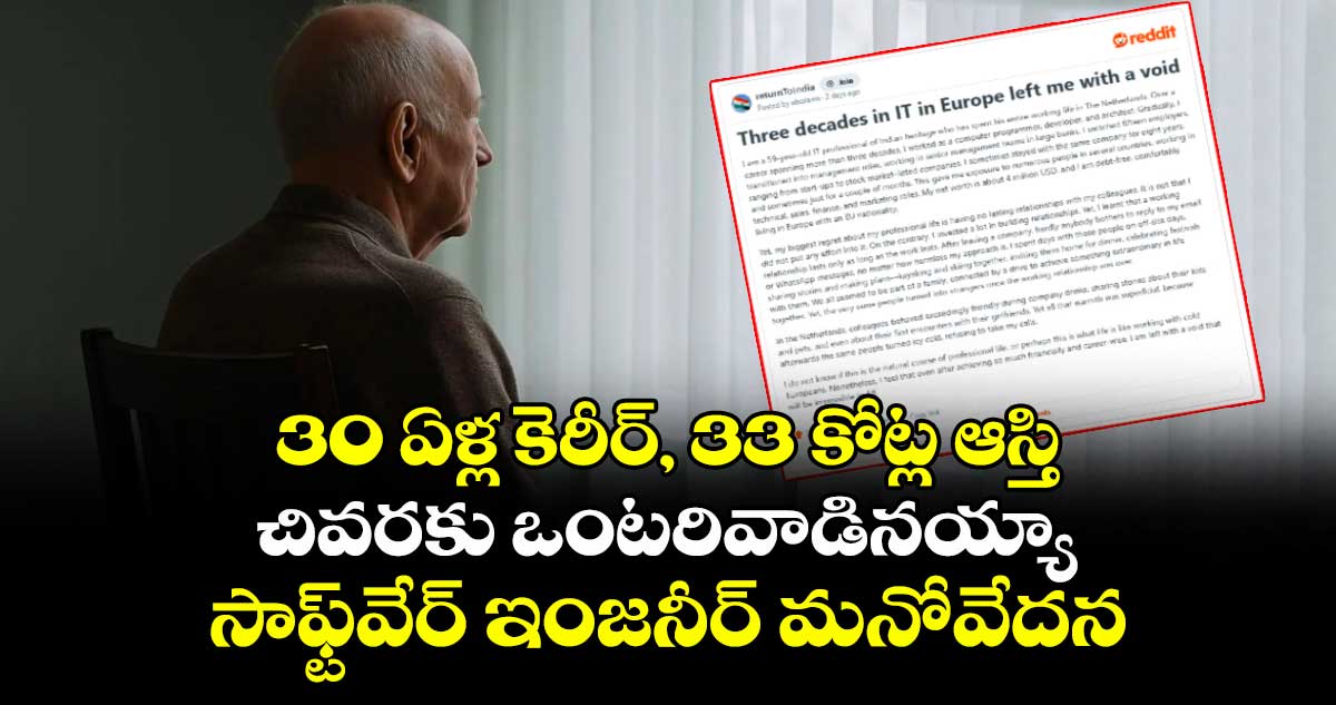యూరప్లో 30 ఏళ్ల పాటు సాఫ్ట్వేర్ రంగంలో రాణించి.. కోట్లాది రూపాయల సంపదను పోగేసినా.. చివరకు మిగిలింది ఒంటరితనమేనంటూ ఓ భారత సంతతి టెక్కీ రాసిన పోస్ట్ ప్రస్తుతం సోషల్ మీడియాలో అందరినీ ఆలోచింపజేస్తోంది. టెక్ రంగంలో సుదీర్ఘ ప్రయాణం తర్వాత చివరకు నాలో మిగిలింది వెలితే అంటూ 59 ఏళ్ల వ్యక్తి పంచుకున్న ఆవేదన ఇప్పుడు ప్రపంచవ్యాప్తంగా ఉన్న ఎన్నారైలను, ఉద్యోగుల మనస్సును తాకుతోంది. నెదర్లాండ్స్లో ప్రోగ్రామర్గా మొదలుపెట్టి.. పెద్ద పెద్ద బ్యాంకుల్లో సీనియర్ మేనేజ్మెంట్ స్థాయికి ఎదిగిన వ్యక్తి, దాదాపు 15 కంపెనీల్లో పనిచేశారు. ఆర్థికంగా చూస్తే సుమారు 33 కోట్ల రూపాయలకు పైగా నికర ఆస్తి, సొంత ఇల్లు, యూరోపియన్ పౌరసత్వం.. ఇలా ఒక సగటు మనిషి కలలుగనేవన్నీ సాధించినా, మనసులో మాత్రం ఒక తీరని లోటు ఉండిపోయిందని ఆయన వాపోయారు.