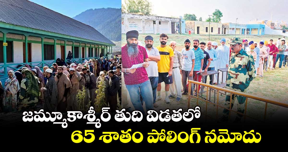 జమ్మూ/శ్రీనగర్: జమ్మూకాశ్మీర్ అసెంబ్లీ ఎన్నికల్లో 65.48 శాతం పోలింగ్ నమోదైంది. మొత్తం 7 జిల్లాల్లోని 40 అసెంబ్లీ సెగ్మెంట్లలో చివరి, మూడో దశ ఎన్నికలు జరిగాయి. ఉదయం 7 నుంచి సాయంత్రం 5 గంటల ఓటర్లు పోలింగ్ కేంద్రాలకు వెళ్లి తమ ఓటుహక్కు వినియోగించుకున్నారు. అన్నిచోట్ల ఎన్నికలు ప్రశాంతంగా ముగిశాయి. ఉధంపూర్ జిల్లాలో అత్యధికంగా 72.91%, సాంబాలో 72.41%, కథువాలో 70.53%, జమ్మూలో 66.79%, బంధిపొరలో 63.33%, కుప్వారాలో 62.76%, బారాముల్లాలో 55.73 శాతం పోలింగ్ నమోదైందని అధికారులు తెలిపారు. చాంబా నియోజకవర్గంలో అత్యధికంగా 77.35% ఓటింగ్ రికార్డయిందని చెప్పారు.