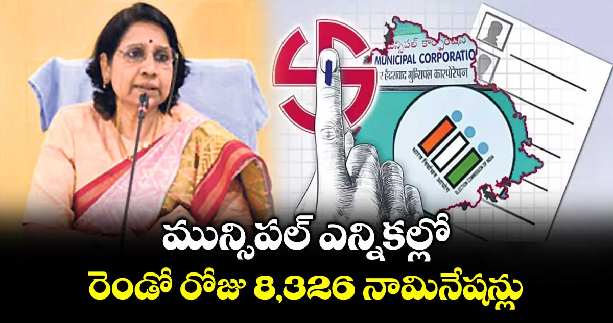 హైదరాబాద్, వెలుగు: మున్సిపల్ ఎన్నికల నామినేషన్ల ప్రక్రియలో భాగంగా రెండో రోజు గురువారం అభ్యర్థుల నుంచి భారీ సంఖ్యలో నామినేషన్లు వచ్చా యి. రాష్ట్ర వ్యాప్తంగా 7,980 మంది అభ్యర్థుల నుంచి 8,326 నామినేషన్లు స్వీకరించినట్లు రాష్ట్ర ఎన్నికల సంఘం కమిషనర్ రాణి కుమిదిని ప్రకటించారు. వీటిలో అత్యధికంగా కాంగ్రెస్ నుంచి 3,379 నామినేషన్లు వచ్చాయని ఎన్నికల అధికారులు తెలిపారు.