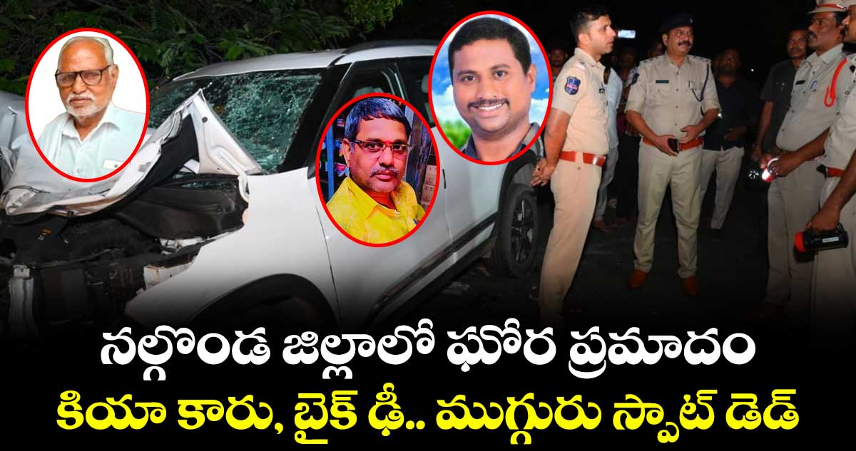 గుర్రంపోడు: నల్గొండ జిల్లా గుర్రంపోడు మండలంలో ఘోర రోడ్డు ప్రమాదం జరిగింది. కియా సెల్టోస్ కారు బైక్ను ఢీ కొట్టిన ఘటనలో ముగ్గురు చనిపోయారు. మరో ముగ్గురికి గాయాలయ్యాయి. వద్దిరెడ్డిగూడెం గ్రామ శివారులో ఈ రోడ్డు ప్రమాదం జరిగింది. అలుగుబెల్లి జైపాల్ రెడ్డికి చెందిన TS 05 FP 2277 కియా సెల్టోస్ కారు గుర్రంపోడు వైపు వస్తున్న TS 05 EV 2192 నెంబర్ గల స్ప్లెండర్ మోటార్ సైకిల్ను ఢీ కొట్టింది.