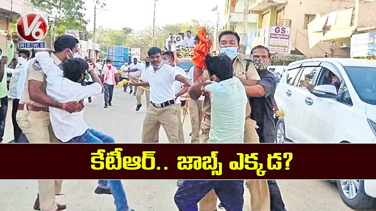 జాబ్నోటిఫికేషన్స్ఇవ్వకుండా యువతను మోసం చేశారంటూ ఏబీవీపీ, బీజేవైఎం నేతలు మంత్రి కేటీఆర్ కాన్వాయ్ని అడ్డుకున్నారు. బుధవారం నాగర్కర్నూల్జిల్లా అచ్చంపేట పర్యటనకు వచ్చిన కేటీఆర్ పట్టణంలో ని అంబేద్కర్ చౌరస్తాలో రోడ్ షో నిర్వహిస్తుండగా బీజేవైఎం, ఏబీవీపీ నేతలు శ్రీకాంత్రాజ్యన్, దేవేందర్నాయక్, చందర్నాయక్, మధు అడ్డుకునేందుకు ప్రయత్నించారు. గత హామీలు నెరవేర్చకుండా మళ్లీ ప్రజలను మోసగించేందుకు వచ్చారా.. అంటూ కేటీఆర్వైపు దూసుకెళ్తుండగా పోలీసులు అడ్డుకుని అరెస్టు చేశారు. గత అచ్చంపేట మున్సిపల్ఎన్నికల సమయంలో ఇచ్చిన హామీలను నెరవేర్చకుండా మరోసారి ఈ ప్రాంత ప్రజలను మోసం చేయడానికి వస్తున్నారంటూ ఈ సందర్భంగా యువకులు నినాదాలు చేశారు. కేటీఆర్ ప్రోగ్రాం ముగిసేవరకు ఏబీవీపీ, బీజేవైఎం నేతలను పోలీస్ స్టేషన్లోనే ఉంచి అనంతరం వదిలిపెట్టారు.