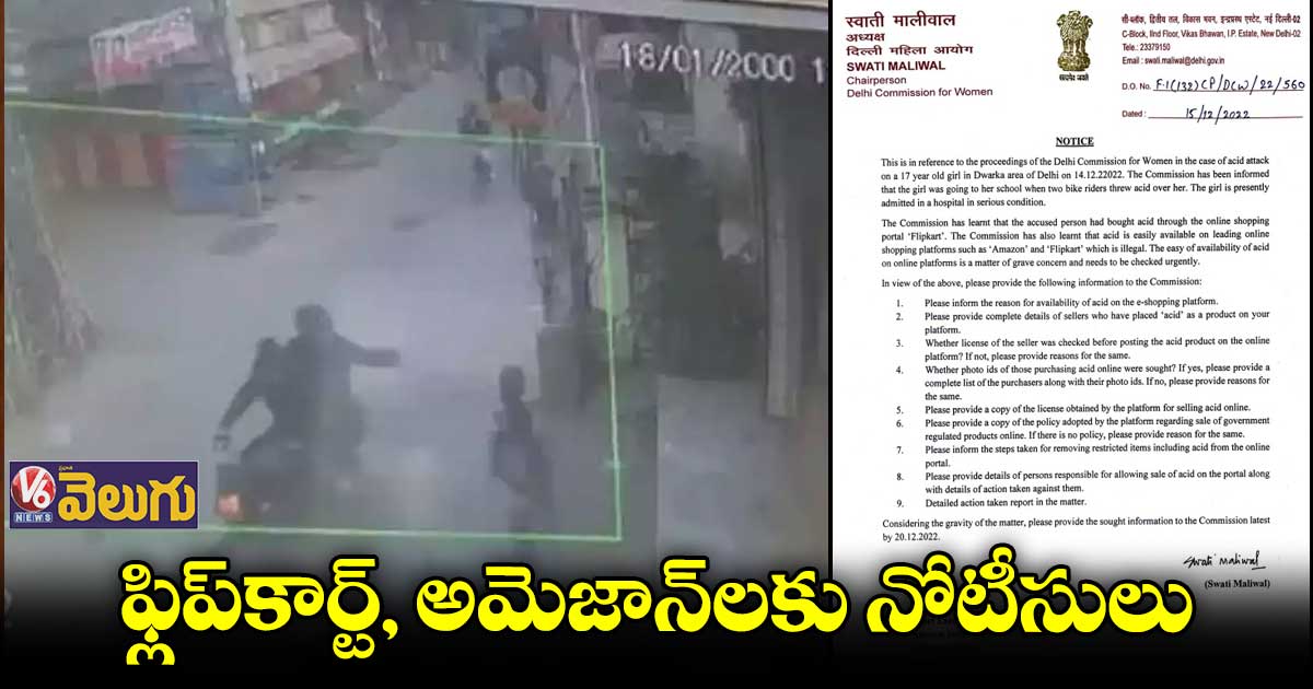 ఢిల్లీలో విద్యార్థినిపై యాసిడ్ దాడి ఘటన నేపథ్యంలో ఆన్ లైన్ షాపింగ్ ఫ్లాట్ ఫామ్స్ ఫ్లిప్కార్ట్, అమెజాన్ లకు ఢిల్లీ మహిళా కమిషన్ నోటీసులు జారీ చేసింది. అత్యంత సులభంగా యాసిడ్ విక్రయించడంపై కమిషన్ ఆగ్రహం వ్యక్తం చేసింది. అంతకు ముందు ఈ ఘటనపై ఢిల్లీ మహిళా కమిషన్ చైర్ పర్సన్ స్వాతి మాలివాల్ విచారం వ్యక్తం చేశారు. ఇలాంటి ఘోరాలు జరగకుండా యాసిడ్ అమ్మకంపై నిషేధం విధించాలని తాము ఎప్పటి నుంచో పోరాడుతున్నా, ప్రభుత్వాలు పట్టించుకోవడం లేదని వాపోయారు. ప్రభుత్వాలు ఇంకెప్పుడు మేల్కొంటాయని ప్రశ్నించారు. మరోవైపు ఈ దారుణానికి పాల్పడిన నిందితులను కఠినంగా శిక్షిస్తామని ఢిల్లీ సీఎం అరవింద్ కేజ్రీవాల్ హామీ ఇచ్చారు. ఇలాంటి ఘటనల్ని ఎట్టి పరిస్థితుల్లోనూ సహించమన్న ఆయన.. నిందితులకు ఇంత ధైర్యం ఎక్కడి నుంచి వచ్చింది? అని ఆగ్రహం వ్యక్తం చేశారు. వాళ్లను కఠినంగా శిక్షిస్తామని, ఢిల్లీలోని ప్రతి బాలిక రక్షణ తమకు ముఖ్యమేనని ట్వీట్ చేశారు.
