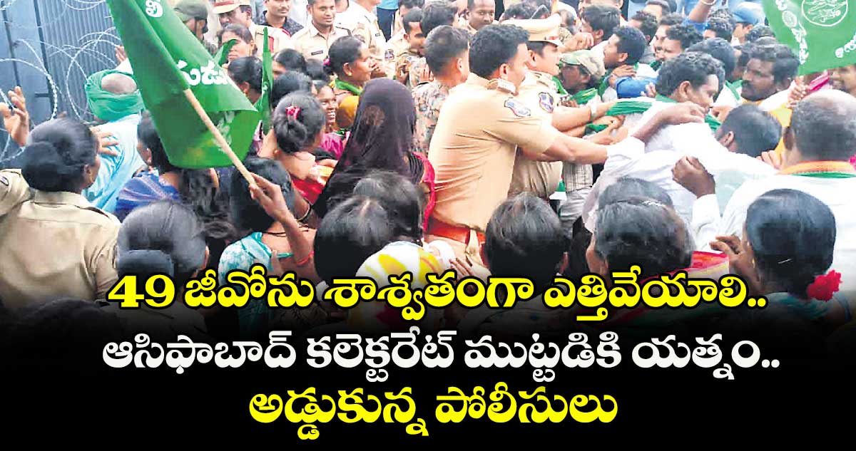 అంతకుముందు తుడుందెబ్బ రాష్ట్ర అధ్యక్షుడు కోట్నాక విజయ్కుమార్ మాట్లాడుతూ అటవీ సంపదపై ఆధారపడి బతుకుతున్న ఆదివాసీలను.. పులుల సంరక్షణ పేరుతో వెళ్లగొట్టే ప్రయత్నాలు చేస్తున్నారని ఆరోపించారు. పీసా చట్టాన్ని తుంగలో తొక్కి ఎలాంటి తీర్మానాలు లేకుండా జీవో అమలుచేయడం సరికాదన్నారు. కేంద్ర, రాష్ట్ర ప్రభుత్వాలు స్పందించి 49 జీవోను శాశ్వతంగా రద్దు చేయాలని, లేకపోతే ఆందోళన ఉధృతం చేస్తామని హెచ్చరించారు. ధర్నాకు బీజేపీ, సీపీఎం, ప్రజాసంఘాల నాయకులు మద్దతు తెలిపారు. కార్యక్రమంలో సిర్పూర్ ఎమ్మెల్యే హరీశ్బాబు, జడ్పీ మాజీచైర్మన్ కోనేరు కృష్ణ, తుడుందెబ్బ జిల్లా అధ్యక్షుడు కోవ విజయ్ పాల్గొన్నారు.