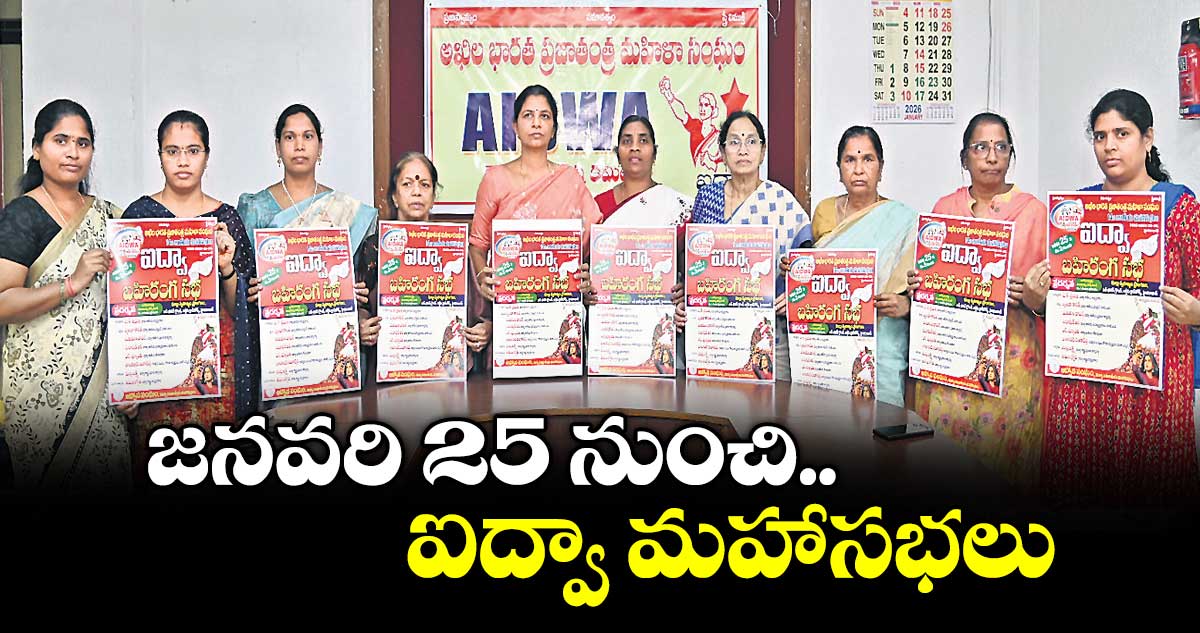 ముషీరాబాద్, వెలుగు: జనవరి 25 నుంచి 28 వరకు హైదరాబాద్ లోని ఆర్టీసీ కల్యాణ మండపంలో జరుగనున్న ఐద్వా 14వ జాతీయ మహాసభలను విజయవంతం చేయాలని సంఘం రాష్ట్ర ప్రధాన కార్యదర్శి మల్లు లక్ష్మి పిలుపునిచ్చారు. ఈనెల 25న బస్ భవన్ ప్రక్కన గ్రౌండ్లో భారీ బహిరంగ సభ నిర్వహించనున్నట్లు తెలిపారు.