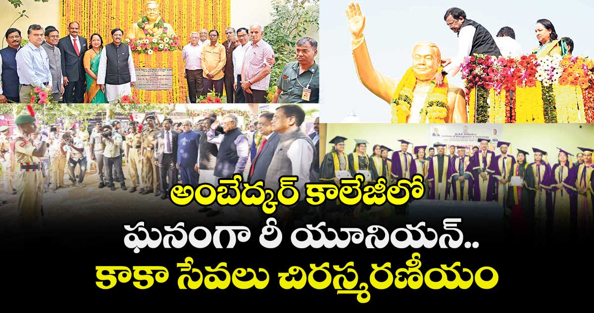 కేంద్ర మాజీ మంత్రి, దివంగత కాంగ్రెస్ నేత గడ్డం వెంకటస్వామి (కాకా) వర్ధంతి సందర్భంగా సోమవారం బాగ్లింగంపల్లిలోని డాక్టర్ బీఆర్ అంబేద్కర్ కాలేజీలో స్టూడెంట్స్ రీ యూనియన్ నిర్వహించారు. ఈ కార్యక్రమానికి గవర్నర్ జిష్ణుదేవ్ వర్మ, అసెంబ్లీ స్పీడర్ గడ్డం ప్రసాద్ కుమార్, కాకా కుటుంబసభ్యులు మంత్రి వివేక్, సరోజ దంపతులు, ఎమ్మెల్యే వినోద్ హాజరయ్యారు. కాకా విగ్రహానికి పూలమాల వేసి నివాళులర్పించారు. ఆయన సేవలను స్మరించుకున్నారు. ఈ సందర్భంగా విద్యార్థుల సాంస్కృతిక ప్రదర్శనలు ఆకట్టుకున్నాయి. అలాగే అంబేద్కర్ లా కాలేజీ గ్రాడ్యుయేషన్ డేలోనూ కాకా కుటంబసభ్యులు పాల్గొన్నారు