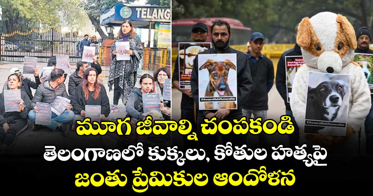 న్యూఢిల్లీ, వెలుగు: తెలంగాణలో కుక్కలు, కోతులను చంపేస్తున్నారని, మూగ జీవాలను చంపొద్దంటూ జంతు ప్రేమికులు ఆందోళనలు చేపట్టారు. ఈ మేరకు శనివారం ఢిల్లీలోని తెలంగాణ భవన్ ఎదుట పీపుల్ ఫర్ ఇండియా ఆధ్వర్యంలో వినూత్నంగా నిరసన తెలిపారు. తెలంగాణ ప్రభుత్వానికి వ్యతిరేకంగా నినాదాలు చేశారు. ఈ సందర్భంగా పీపుల్ ఫర్ ఇండియా ప్రతినిధులు మాట్లాడారు.