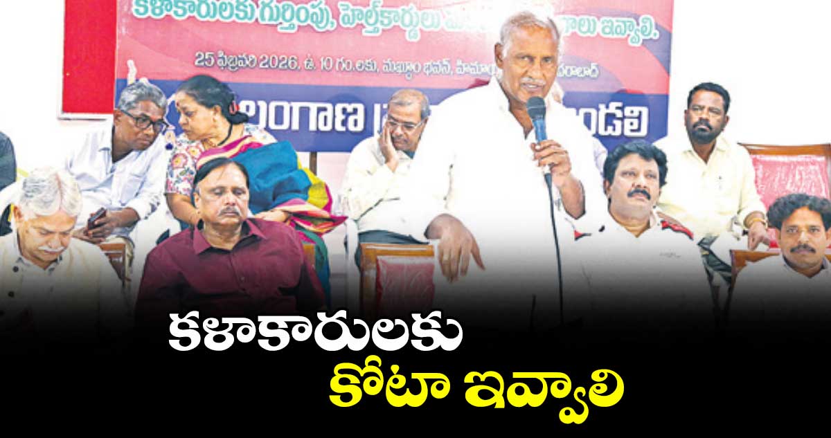 హైదరాబాద్, వెలుగు: రాష్ట్రంలో క్రీడారంగానికి అమలు చేస్తున్న కోటా తరహాలోనే సాంస్కృతిక రంగానికి కోటా కేటాయించాలని, కళాకారులకు గుర్తింపు కార్డులు, హెల్త్ కార్డులు అందించి ఆదుకోవాలని పలువురు ప్రముఖులు ప్రభుత్వాన్ని డిమాండ్చేశారు. తెలంగాణ ప్రజానాట్యమండలి ఆధ్వర్యంలో ‘సమగ్ర సాంస్కృతిక విధానం- కళాకారులకు గుర్తింపు, ఉద్యోగాలు’ అనే అంశంపై బుధవారం హైదరాబాద్లోని మగ్దూంభవన్లో ఆ సంస్థ రాష్ట్ర ప్రధాన కార్యదర్శి పల్లె నర్సింహ అధ్యక్షతన రౌండ్ టేబుల్ సమావేశం జరిగింది. దీనికి సీపీఐ రాష్ట్ర కార్యదర్శి కూనంనేని సాంబశివరావు, మీడియా అకాడమీ చైర్మన్ కె. శ్రీనివాస్రెడ్డి, సాంస్కృతిక సారథి చైర్పర్సన్ జి.వి. వెన్నెల ముఖ్య అతిథులుగా హాజరయ్యారు.