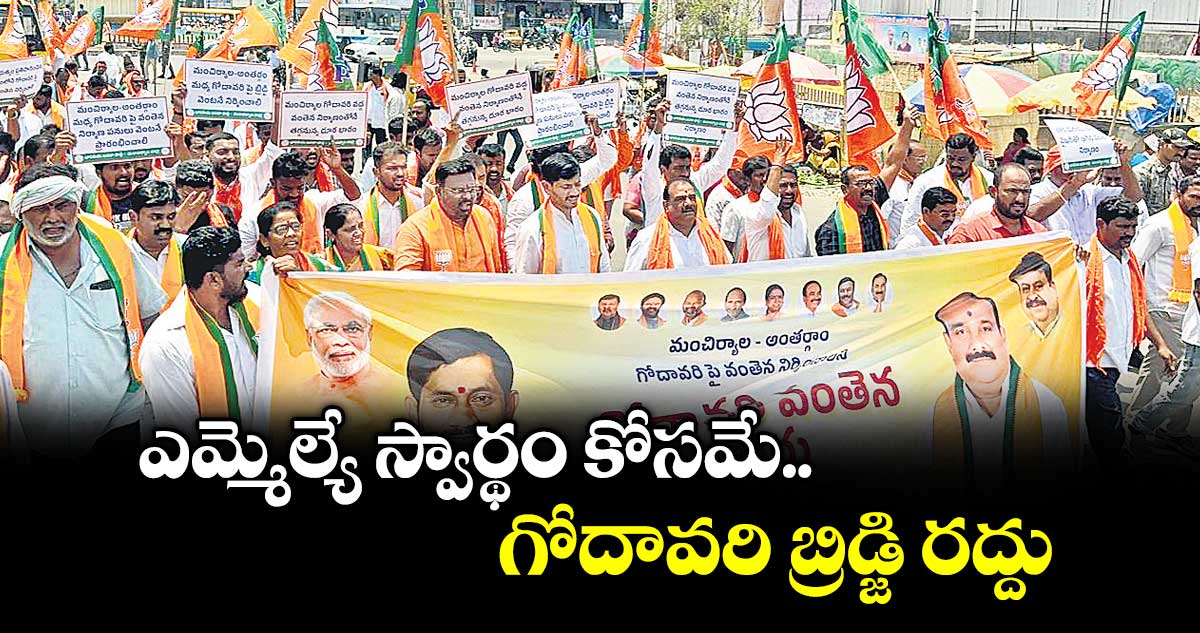 మంచిర్యాల, వెలుగు: మంచిర్యాల–అంతర్గాం మధ్య గోదావరిపై మంజూరైన బ్రిడ్జిని ఎమ్మెల్యే ప్రేమ్సాగర్రావు తన స్వార్థ ప్రయోజనాల కోసం రద్దు చేయించారని బీజేపీ స్టేట్ వైస్ ప్రెసిడెంట్ వెరబెల్లి రఘునాథ్ రావు విమర్శించారు. ప్రజల సౌకర్యార్థం వెంటనే బ్రిడ్జి నిర్మించాలని డిమాండ్ చేస్తూ సోమవారం బీజేపీ ఆధ్వర్యంలో మంచిర్యాల ఐబీ చౌరస్తాలో ధర్నా చేపట్టారు. ఆయన మాట్లాడుతూ గత ప్రభుత్వం ప్రతిపాదించిన ప్రదేశంలోనే గోదావరిపై వంతెన నిర్మించాలన్నారు.