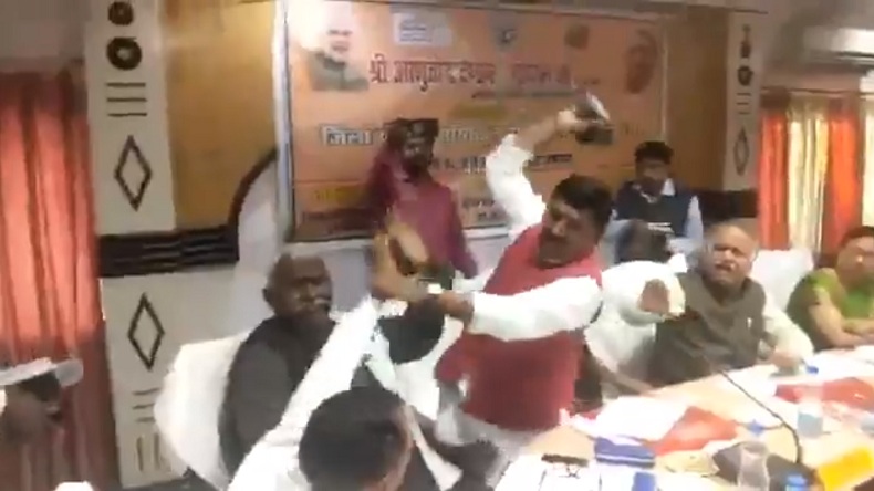 #WATCH Sant Kabir Nagar: BJP MP Sharad Tripathi and BJP MLA Rakesh Singh exchange blows after an argument broke out over placement of names on a foundation stone of a project pic.twitter.com/gP5RM8DgId