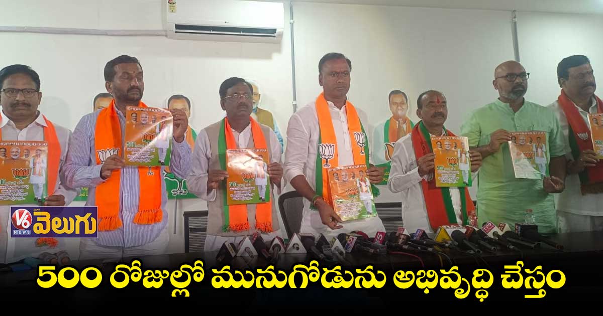 మునుగోడు డెవలప్మెంట్ కోసం బీజేపీ మాస్టర్ ప్లాన్ రెడీ చేసింది. నియోజకవర్గ అభివృద్ధి కోసం కోసం తీసుకునే చర్యలను వివరిస్తూ ఆ పార్టీ మేనిఫెస్టో విడుదల చేసింది. 500 రోజుల్లో మునుగోడును సమగ్రంగా అభివృద్ధి చేస్తామని బీజేపీ అభ్యర్థి రాజగోపాల్ రెడ్డి ప్రకటించారు. కేంద్రం పెద్దలతో మాట్లాడే ఈ హామీలు ఇస్తున్నట్లు చెప్పారు. తెలంగాణకు బీజేపీయే శ్రీరామ రక్ష అన్న ఆయన.. రాష్ట్రం బాగుపడాలంటే తమ వల్లే సాధ్యమని చెప్పారు. కనీసం రోడ్లు వేయిద్దామన్నా.. కాంట్రాక్టర్లు టెండర్లు వేసే పరిస్థితి లేదని రాజగోపాల్ వాపోయారు.