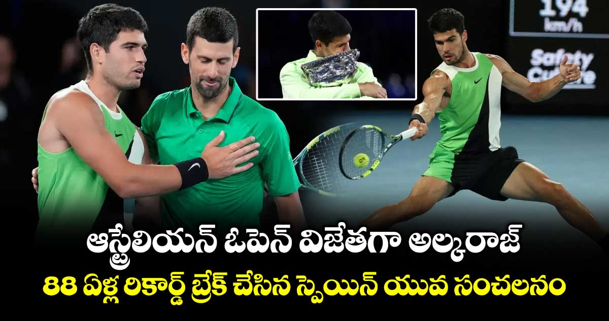 మెల్ బోర్న్: ఆస్ట్రేలియన్ ఓపెన్ మెన్స్ సింగిల్స్ విజేతగా స్పెయిన్ యువ సంచలనం కార్లోస్ అల్కరాజ్ నిలిచాడు. ఆదివారం (ఫిబ్రవరి 1) హోరాహోరీగా జరిగిన ఫైనల్ పోరులో నోవాక్ జొకోవిచ్ను ఓడించి తొలిసారి ఆస్ట్రేలియన్ ఓపెన్ కిరీటాన్ని ముద్దాడాడు. తద్వారా అల్కరాజ్ 88 సంవత్సరాల రికార్డ్ బ్రేక్ చేశాడు. డాన్ బడ్జ్ రికార్డును బద్దలు కొట్టి కెరీర్ గ్రాండ్ స్లామ్ను పూర్తి చేసిన అతి పిన్న (22 సంవత్సరాల 272 రోజులు) వయస్కుడిగా నిలిచాడు. కెరీర్లో 25వ గ్రాండ్స్లామ్ టైటిల్ కోసం ఎంతో కాలంగా వేచిచూస్తోన్న జొకోవిచ్కు మరోసారి నిరాశే ఎదురైంది.