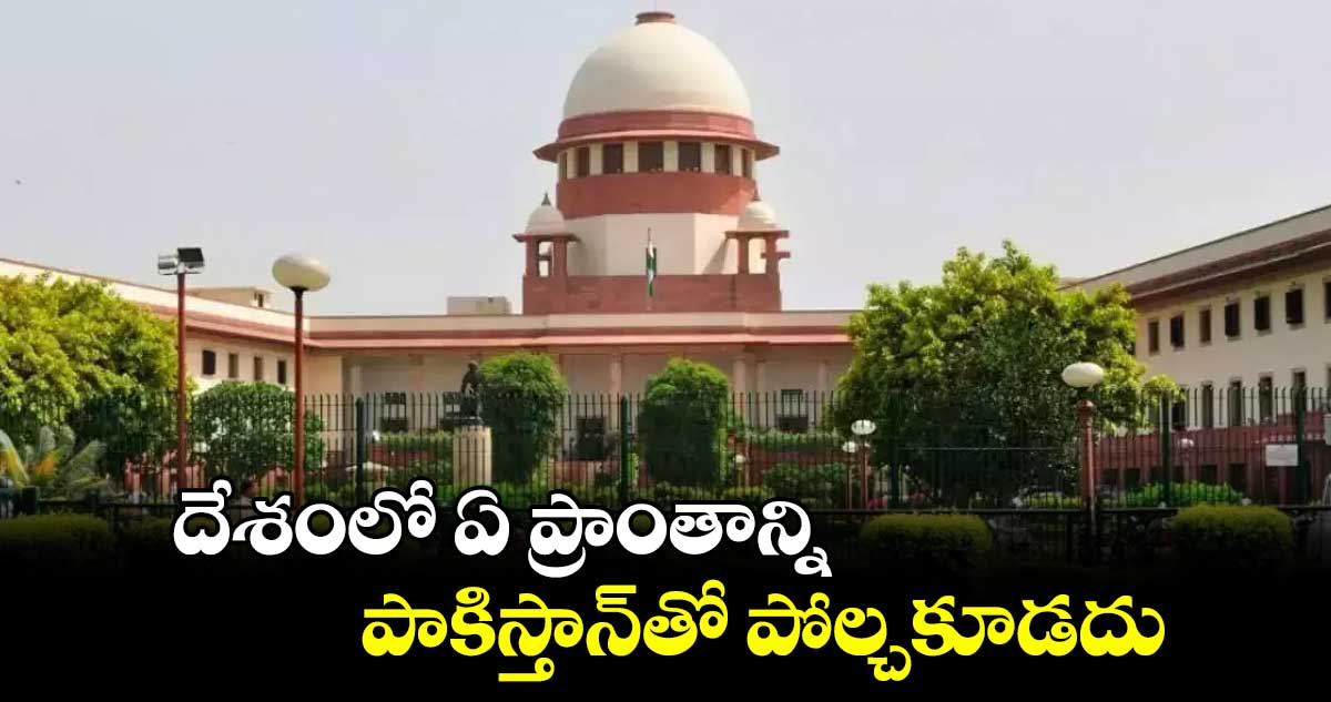 దేశ అత్యున్నత న్యాయస్థానం సుప్రీంకోర్టు ధర్మాసనం కీలక వ్యాఖ్యలు చేసింది. దేశంలోని ఏ ప్రాంతాన్ని పాకిస్తాన్ తో పోల్చకూడదని చీఫ్ జస్టిస్ డీవైచంద్రచూడ్ తో కూడిన సుప్రీంకోర్టు డివిజన్ బెంచ్ ఆదేశించింది. ఓ కేసులో కర్ణాటక హైకోర్టు న్యాయమూర్తి చేసిన వ్యాఖ్యలను సుప్రీంకోర్టు సుమోటోగా స్వీకరించింది.కర్ణాటక హైకోర్టు జస్టిస్ వేదవ్యాసాచార్ శ్రీశనాంద బహిరంగా క్షమాపణలు చెప్పడంతో విచార ణను మూసేవేస్తూ ఈ కీలక వ్యాఖ్యలు చేసింది ఐదుగురు జడ్జీలతో కూడిన సుప్రీంకోర్టు ధర్మాసనం.