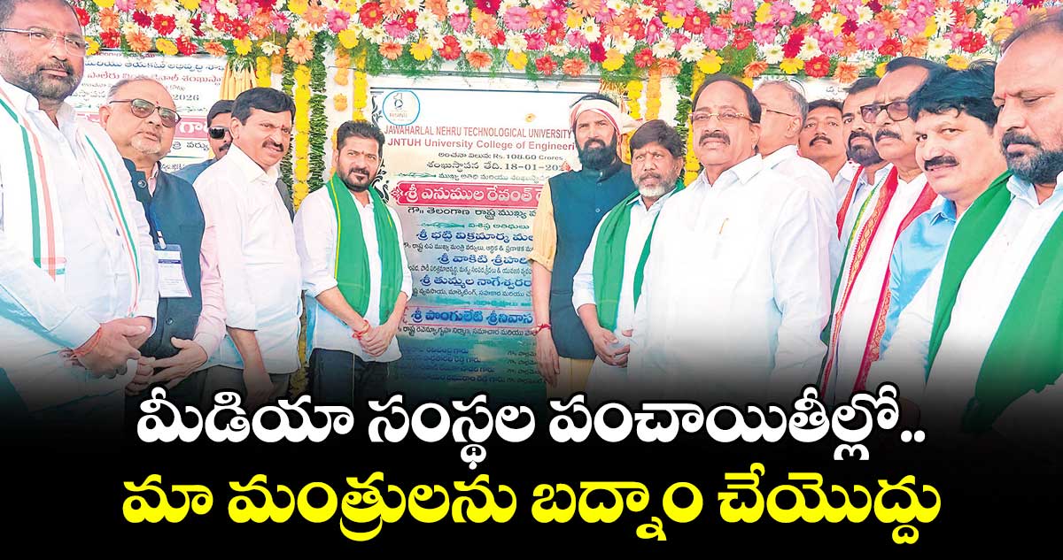 ఖమ్మం, వెలుగు: మీడియా సంస్థల మధ్య పంచాయితీల్లో తమ మంత్రుల్ని బద్నాం చేయొద్దని సీఎం రేవంత్ రెడ్డి కోరారు. ‘మీ మధ్య వైరుధ్యాలు ఉంటే తలుపులు మూసుకొని కొట్టుకోండి.. మీరు మీరూ తేల్చుకోండి’ అని సూచించారు. ఇటీవల మంత్రులపై పలు ఆరోపణలు చేస్తూ రెండు మీడియా సంస్థల్లో వచ్చిన కథనాలపై సీఎం రేవంత్ రెడ్డి స్పందించారు. మంత్రి కోమటిరెడ్డి వెంకట్రెడ్డికి, ఓ లేడీ ఐఏఎస్ ఆఫీసర్కు సంబంధం అంటగడుతూ ఎన్టీవీలో కొద్ది రోజుల కింద ఓ కథనం ప్రసారమైన సంగతి తెలిసిందే. దీనిపై ఐఏఎస్ ఆఫీసర్ల ఫిర్యాదు మేరకు ప్రభుత్వం స్పెషల్ ఇన్వెస్టిగేషన్ టీం (సిట్) వేయగా.. దర్యాప్తు కొనసాగుతున్నది. ఇదిలా ఉండగా.. ఎన్డీవీలో వచ్చిన కథనం.. నైనీ బొగ్గు టెండర్ల కోసం జరిగిన పెద్ద కుట్ర అంటూ మరో మీడియా చానల్, పత్రికలో కథనం రాశారు. ఇందులో ఏకంగా డిప్యూటీ సీఎం భట్టి విక్రమార్క, ఎన్టీవీ మీడియా చానల్ యాజమాన్యానికి పాత్ర ఉందని ఆరోపించారు. ఎన్టీవీ చానల్ యజమాని నరేంద్రనాథ్ చౌదరి అల్లుడికి బొగ్గు టెండర్ కట్టబెట్టేందుకు అడ్డుగా ఉన్న మరో మంత్రి కోమటిరెడ్డి వెంకట్రెడ్డిని దారిలోకి తెచ్చుకునేందుకే ఆ కల్పిత కథనాలు ప్రసారం చేశారంటూ రాసుకొచ్చారు.