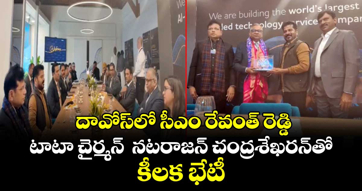 ప్రపంచ ఆర్థిక వేదిక అయిన వరల్డ్ ఎకనామిక్ ఫోరం (WEF) వార్షిక సదస్సు 2026 స్విట్జర్లాండ్లోని దావోస్లో ఘనంగా జరుగుతోంది. ఈ సదస్సులో తెలంగాణ సీఎం రేవంత్ రెడ్డి పాల్గొని రాష్ట్రానికి అంతర్జాతీయ స్థాయిలో ప్రాతినిధ్యం వహిస్తున్నారు. ఈ క్రమంలో బుధవారం ( జనవరి 21 ) టాటా చైర్మెన్ నటరాజన్ చంద్రశేఖరన్ తో భేటీ అయ్యారు సీఎం రేవంత్ రెడ్డి. ఈ భేటీలో విజన్–2047 లక్ష్యాలు.. పెట్టుబడులకు ఉన్న అనుకూల విధానాలను టాటా చైర్మెన్ కు వివరించారు సీఎం రేవంత్ రెడ్డి.