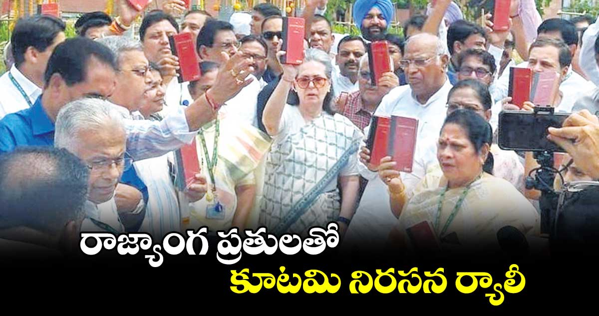 న్యూఢిల్లీ: పద్దెనిమిదవ లోక్సభ తొలి సెషన్ మొదటిరోజు ప్రతిపక్ష ఇండియా కూటమి బలప్రదర్శన చేసింది. కూటమి పార్టీలకు చెందిన నేతలంతా పార్లమెంట్ పాత బిల్డింగ్ వద్ద కలుసుకున్నారు. ఆపై చేతుల్లో రాజ్యాంగ ప్రతులు పట్టుకుని కొత్త భవనం వద్దకు ర్యాలీగా వచ్చారు. మహాత్మాగాంధీ విగ్రహం ఉన్న ప్రాంతంలో రాజ్యాంగ ప్రతులను చూపుతూ "ప్రజాస్వామ్యాన్ని కాపాడుదాం. రాజ్యాంగాన్ని బతికిద్దాం. రాజ్యాంగాన్ని రక్షిద్దాం" అంటూ నినాదాలు చేశారు.