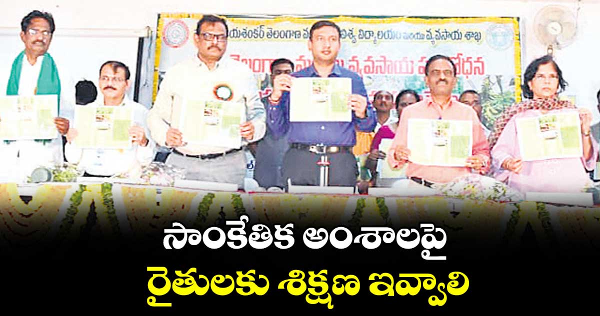 సాగులో డ్రోన్ల వినియోగం, నేల పరీక్షల ఆధారంగా ఎరువుల వాడకం వంటి అంశాలపై రైతులకు శిక్షణ ఇవ్వాలని సూచించారు. సంప్రదాయ పంటలకే పరిమితం కాకుండా, డిమాండ్ ఉన్న ఆయిల్ పామ్ వంటి వాణిజ్య పంటలు, అంతర పంటల సాగుపై రైతులను ప్రోత్సహించాలన్నారు. అనంతరం సోయాబీన్ విత్తనోత్పత్తి, చీడ పీడలకు సంబంధించిన అవగాహన పత్రాలను ఆవిష్కరించారు. కార్యక్రమంలో జేడీఏ శ్రీధర్, పీజేటీఎస్ఏయూ పరిశోధన సంచాలకుడు ఎం.బాల్ రాజ్, విస్తరణ సంచాలకుడు యాకాద్రి, ప్రిన్సిపల్ సైంటిస్ట్ శ్రీధర్ చౌహాన్ తదితరులు పాల్గొన్నారు.