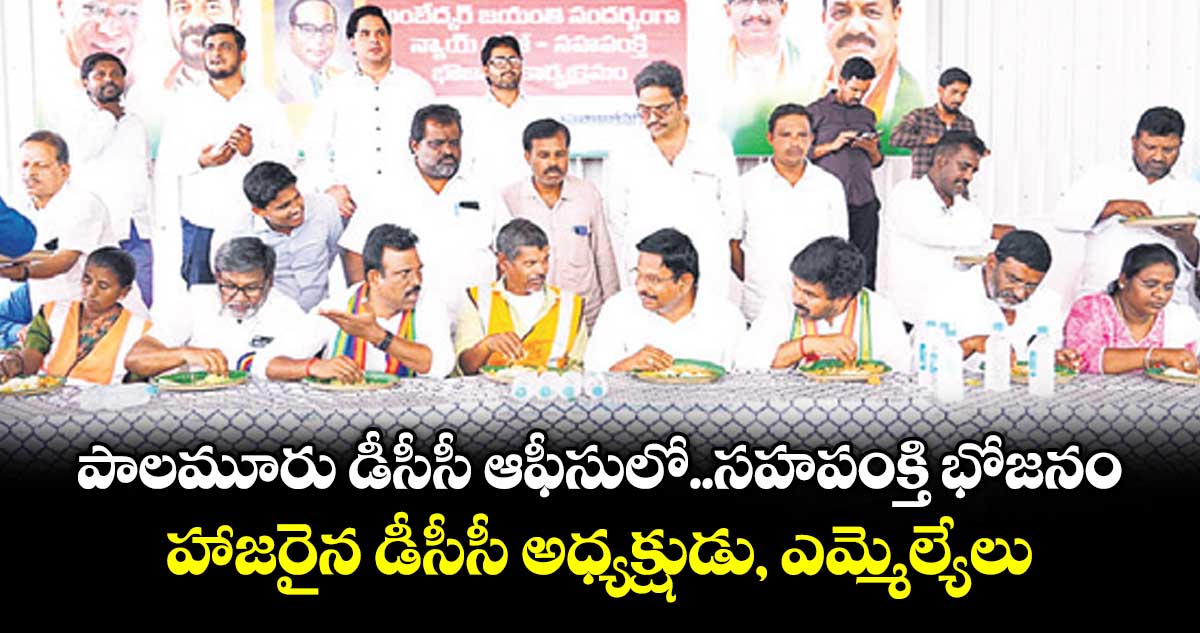 మహబూబ్నగర్ అర్బన్, వెలుగు : బీఆర్ అంబేద్కర్ జయంతి సందర్భంగా మహబూబ్నగర్ కాంగ్రెస్ పార్టీ ఆఫీసులో డీసీసీ అధ్యక్షుడు సంజీవ్ ముదిరాజ్ ఆధ్వర్యంలో సహపంక్తి భోజనం ఏర్పాటు చేశారు. కార్యక్రమానికి అధ్యక్షుడితోపాటు ప్రభుత్వ విప్, మహబూబ్నగర్ ఎమ్మెల్యే యెన్నం శ్రీనివాస్ రెడ్డి, దేవరకద్ర ఎమ్మెల్యే జి.మధుసూదన్ రెడ్డి, రాష్ట్ర మైనార్టి ఫైనాన్స్ కార్పొరేషన్ చైర్మన్ ఒబేదుల్లా కొత్వాల్, మేయర్ మమత, డిప్యూటీ మేయర్ ఎం.సురేందర్ రెడ్డి పాల్గొన్నారు.
