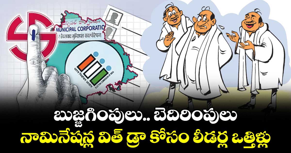 ఈనెల 3 వరకు నామినేషన్ల విత్ డ్రా కోసం గడువుంది. ఈలోగా నామినేషన్ ఉపసంహరించుకొని పోటీ నుంచి తప్పుకోవాలని అభ్యర్థులను నాయకులు కోరుతున్నారు. రానున్న రోజుల్లో మంచి పదవులు ఇస్తామని బుజ్జగిస్తున్నారు. అందుకు వినకుంటే వారి దందాల సంగతి చూస్తా మని, పార్టీ నుంచి సస్పెండ్ చేస్తామని బెదిరింపులకు పాల్పడుతున్నట్టు తెలుస్తోంది.