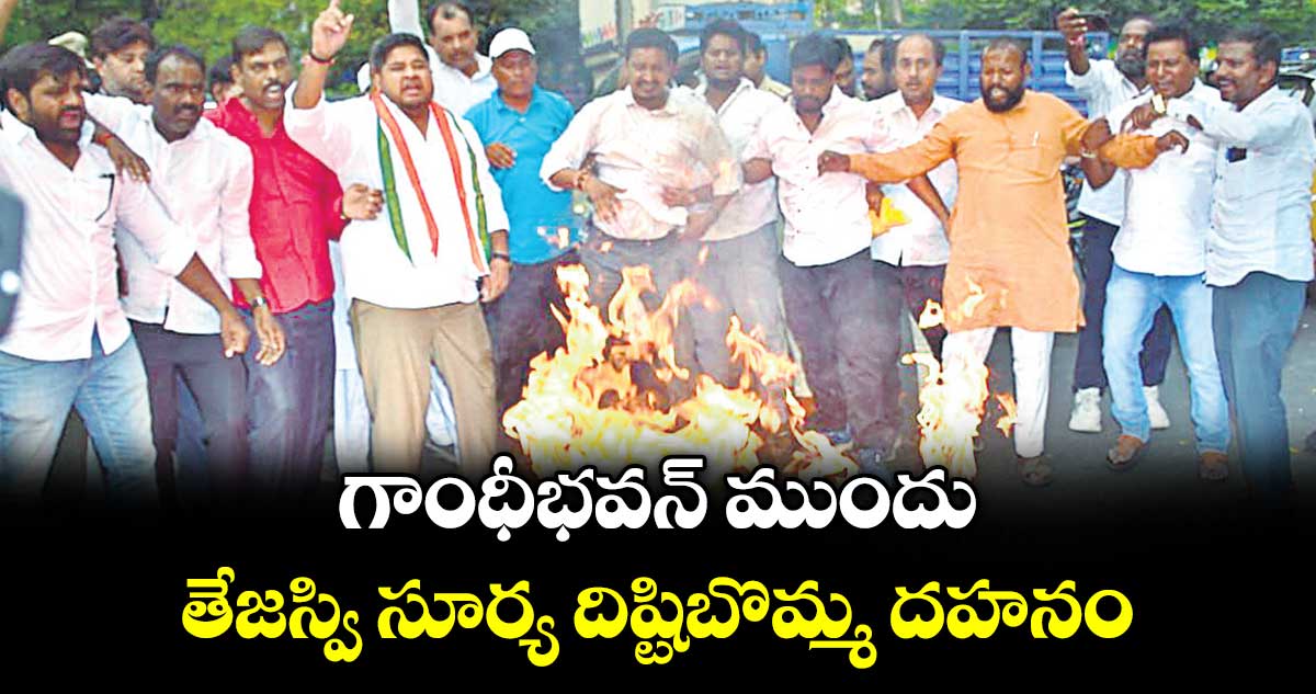 హైదరాబాద్, వెలుగు: తెలంగాణపై తేజస్వి సూర్య చేసిన వ్యాఖ్యలపై రాష్ట్ర కాంగ్రెస్ నేతలు భగ్గుమన్నారు. గురువారం ఖైరతాబాద్ డీసీసీ ఆధ్వర్యంలో తేజస్వి దిష్టి బొమ్మను తగలబెట్టి ఆయనకు, ప్రధాని మోదీకి వ్యతిరేకంగా నినాదాలు చేశారు. తేజస్వి మాటలు ఆయన అజ్ఞానానికి నిదర్శనమని మంత్రి జూపల్లి కృష్ణారావు అన్నారు. ఆయన వ్యాఖ్యలు తెలంగాణ ఆత్మగౌరవాన్ని, అమరుల త్యాగాలను అవమానించడమేనని గురువారం ఒక ప్రకటనలో మండిపడ్డారు.