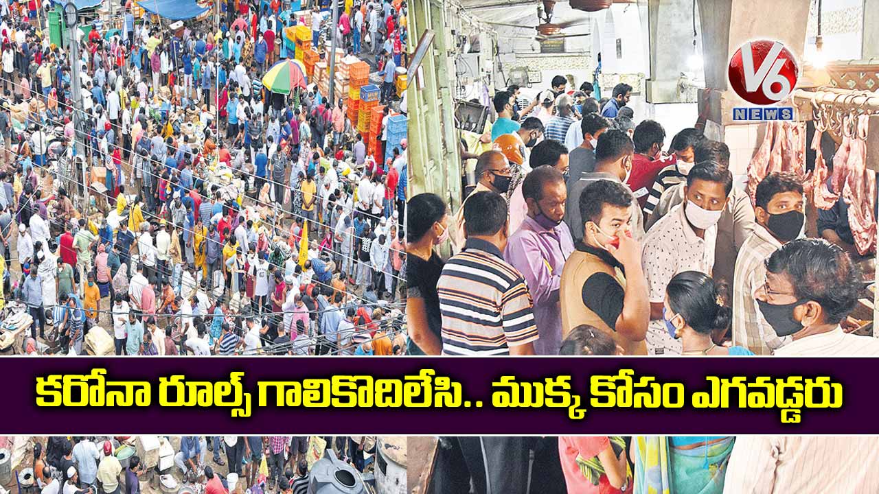ఉదయం 6 గంటల నుంచే జనాలు మటన్, చికెన్ దుకాణాలకు క్యూ కట్టారు. ఎక్కడ దుకాణాలు మూసేస్తారోనని ఆగమాగం చేశారు. కరోనా కట్టడికి లాక్డౌన్ అమలవుతుంటే.. అదేమీ జనానికి పట్టలేదు. సోషల్ డిస్టెన్స్ పాటించలేదు. కొందరైతే మాస్కులు కూడా పెట్టుకోలేదు. హైదరాబాద్లోని జియాగూడ, మోండా మార్కెట్, అమీర్ పేట్, బేగంపేట్, పంజాగుట్ట, ఎర్రగడ్డ, సనత్ నగర్, అంబర్పేట్, చిలకలగూడ, కొత్తపేట, దిల్సుఖ్నగర్ తదితర ప్రాంతాలతోపాటు జిల్లాల్లోనూ ఇదే పరిస్థితి కనిపించింది. కొన్ని చోట్ల తమకంటే వెనుక వచ్చినవాళ్లకు ఎట్ల ఇస్తారంటూ జనాలు లొల్లులు పెట్టుకున్నారు. హైదరాబాద్లోని ముషీరాబాద్– -రాంనగర్ చేపల మార్కెట్ జనంతో కిక్కిరిసిపోయింది. రాష్ట్రంలోని వైన్స్ వద్దాకూడా ఆదివారం జనం బారులు దీరారు.