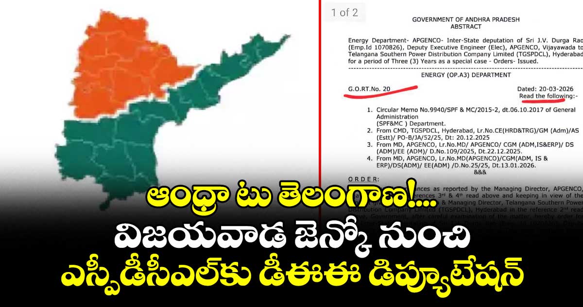 ఏపీ జెన్కో సంస్థ పరిధిలోని విజయవాడలో పనిచేస్తున్న ఎలక్ట్రికల్ డిప్యూటీ ఎగ్జిక్యూటివ్ ఇంజినీర్( డీఈఈ) జేవీ దుర్గారావును అక్కడి రాష్ట్ర ప్రభుత్వం మూడేండ్ల పాటు డిప్యూటేషన్ పై తెలంగాణ రాష్ట్రానికి పంపిస్తూ స్పెషల్ చీఫ్ సెక్రటరీ కె.విజయానంద్ఈ నెల 20న జీవో నంబర్.20 రిలీజ్చేశారు. దీనికంటే ముందుగా ఈ డిప్యూటేషన్ విషయమై గతేడాది డిసెంబర్ 22న ఎస్పీడీసీఎల్సీఎండీ ఆఫీస్ నుంచి ఏపీ ప్రభుత్వానికి లెటర్నంబర్ సీఈ, పీవో–బీ/జేఏ/52/25 పంపించారు.