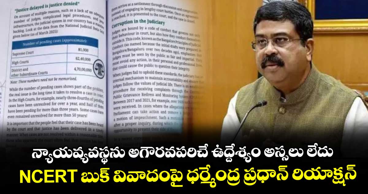 ఎన్సీఈఆర్టీ ప్రచురించిన 8వ తరగతి సోషల్ సైన్స్ బుక్ ప్రచురణ, అమ్మకాలను నిషేధించింది. న్యాయవ్యవస్థను అపహాస్యం చేసేలా పుస్తకంలో సెలబస్ పెట్టడంపై వివరణ ఇవ్వాలని కేంద్ర విద్యాశాఖ సెక్రటరీ, ఎన్సీఈఆర్టీ డైరెక్టర్ దినేష్ ప్రసాద్ సక్లానీకి నోటీసులు జారీ చేసింది. ఈ క్రమంలో ఎన్సీఈఆర్టీ బుక్ వివాదంపై కేంద్ర విద్యా శాఖ మంత్రి ధర్మేంద్ర ప్రధాన్ స్పందించారు.