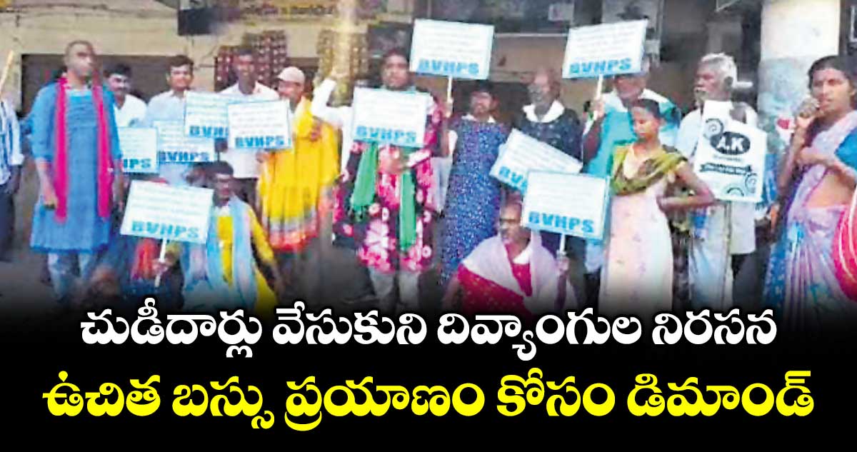 పరిగి, వెలుగు: ఎన్నికల హామీ ప్రకారం ఆర్టీసీ బస్సుల్లో దివ్యాంగులకు ఉచిత ప్రయాణ సౌకర్యం కల్పించాలని కోరుతూ వికారాబాద్ జిల్లా పరిగి బస్టాండ్లో వినూత్న నిరసన చేపట్టారు. భారత దివ్యాంగుల హక్కుల పరిరక్షణ సమితి రాష్ట్ర అధ్యక్షుడు గిద్దె రాజేశ్ ఆధ్వర్యంలో మహిళా వేషధారణలో నిరసన వ్యక్తం చేశారు. దివ్యాంగులకు నెలకు రూ. 6,000 పెన్షన్ ఇస్తామన్న హామీని సీఎం రేవంత్ రెడ్డి తక్షణమే నెరవేర్చాలని డిమాండ్ చేశారు.