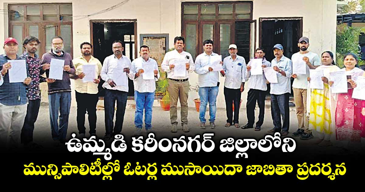 కరీంనగర్, వెలుగు: ఉమ్మడి కరీంనగర్ జిల్లాలోని పలు మున్సిపాలిటీల్లో ముసాయిదా ఓటర్ల జాబితాను గురువారం ప్రదర్శించారు. కరీంనగర్ జిల్లాలోని హుజూరాబాద్, చొప్పదండి, జమ్మికుంట మున్సిపాలిటీల్లో వార్డులు, ఓటర్ల ముసాయిదా జాబితాను అధికారులు ప్రదర్శించారు. కరీంనగర్ మున్సిపల్ కార్పొరేషన్ లో మాత్రం రాత్రి 9 దాటినా డివిజన్ల వారీగా ముసాయిదాను ప్రదర్శించలేదు.