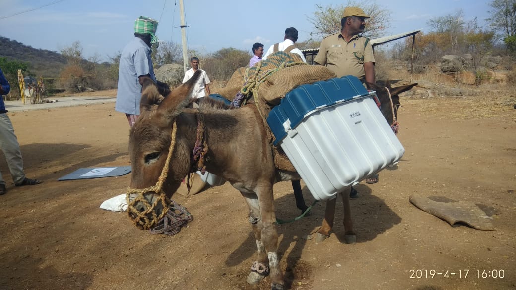 తమిళనాడు : కొడైకెనాల్ లో పోలింగ్ అధికారులు ఏర్పాట్ల కోసం కష్టాలు పడుతున్నారు. కష్టపడి గుట్టలు.. చెట్లు.. కాలువలు దాటి… కొండ ప్రాంతాలపైకి ట్రెక్కింగ్ చేసి… అక్కడున్న రిమోట్ గ్రామాల్లో పోలింగ్ ఏర్పాట్లు చేస్తున్నారు. పోలింగ్ సామాగ్రి మోసుకుపోవడం సాధ్యం కాకపోవడంతో.. గాడిదలు, గుర్రాలను ఉపయోగిస్తున్నారు. ఈవీఎం మెషీన్లు, ఎలక్షన్ సామాన్లను బ్యాగుల్లో సర్ది గాడిదల సహాయంతో.. వాటిని కొండ గ్రామాలకు చేర్చారు. కనీసం నడవడానికి కూడా దారి లేని ఈ ప్రాంతాల్లో… అధికారుల రోజంతా కష్టపడి గమ్యస్థానాలకు చేరుకున్నారు.
