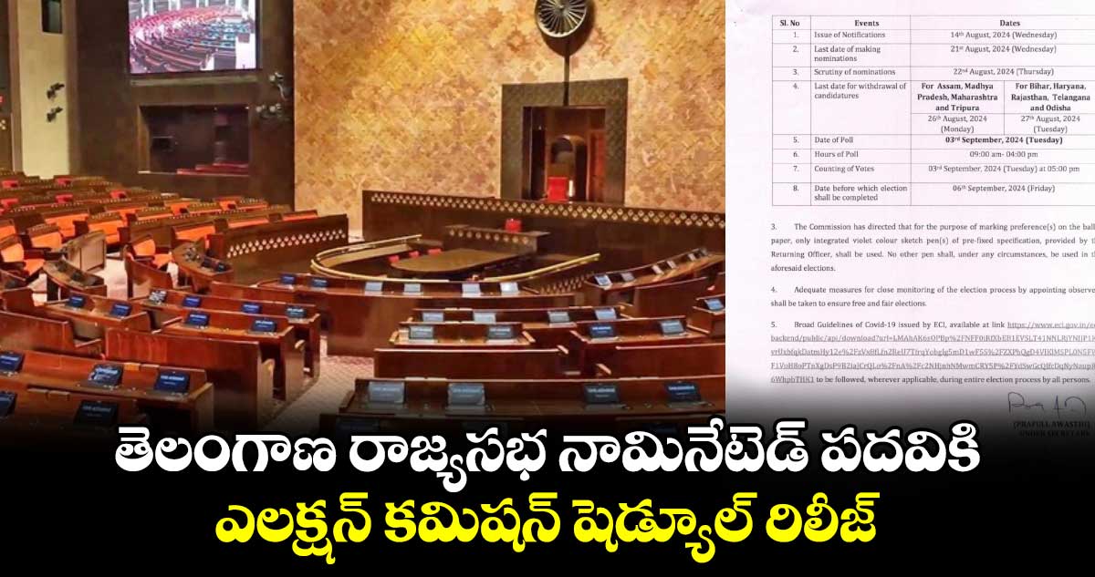 బీఆర్ఎస్ నుంచి రాజ్యసభ ఎంపీగా నామినేట్ అయిన కే.కేశవరావు తన ఎంపీ పదవికి రాజీనామా చేసి.. కాంగ్రెస్లో చేరారు. దీంతో ప్రస్తుతం ఆ సీటు ఖాళీగా ఉంది. తెలంగాణాలోని రాజ్య సభ సీటుతోపాటు వివిధ రాష్ట్రాల్లో రాజ్యసభ సభ్యుల ఎన్నికలకు కేంద్ర ఎన్నికల సంఘం నోటిఫికేషన్ రిలీజ్ చేసింది. ఆగస్ట్ 14 నుంచి 21 వరకు నామినేషన్ ప్రక్రియ కొనసాగనుంది.