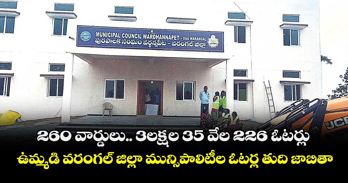 వరంగల్, వెలుగు: త్వరలోనే ఎన్నికలు రానున్న నేపథ్యంలో మున్సిపాలిటీల్లో ఓటర్ల తుది జాబితా ప్రకటించారు. రాష్ట్ర ఎన్నికల సంఘం ఆదేశాల మేరకు ఇటీవల అధికారులు ఓటర్ల ముసాయిదాను వెల్లడించారు. అందులో ప్రకటించిన ఓటర్ల జాబితాపై అభ్యంతరాలుంటే తెలపాలని కోరారు. మొత్తంగా గడువు ముగియడంతో అధికారులు సోమవారం తుది జాబితాను ప్రకటించారు. ఉమ్మడి వరంగల్ లోని 6 జిల్లాల్లో 12 మున్సిపాలిటీల పరిధిలోని 260 వార్డుల్లో మొత్తం 3,35,226 మంది ఓటర్లు ఉన్నారు.