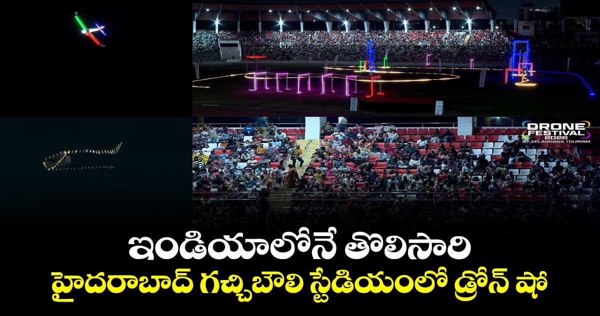 ఇండియాలోనే తొలిసారిగా హైదరాబాద్ లో డ్రోన్ షో నిర్వహిస్తున్నారు. తెలంగాణ టూరిజం డిపార్టుమెంట్ ఆధ్వర్యంలో నిర్వహిస్తున్న డ్రోన్ డే, రేసింగ్ ఇవాళ్టి నుంచి రెండు రోజుల పాటు (జనవరి 16-17) కొనసాగనుంది. గచ్చిబౌలి ఔట్ డోర్ స్టేడియంలో నిర్వహిస్తున్న షో జనవరి 15 సాయంత్రం 5 గంటలకు ప్రారంభమైంది. ఈ షో ను చూసేందుకు నగరవాసులు భారీగా స్టేడియానికి చేరుకున్నారు.