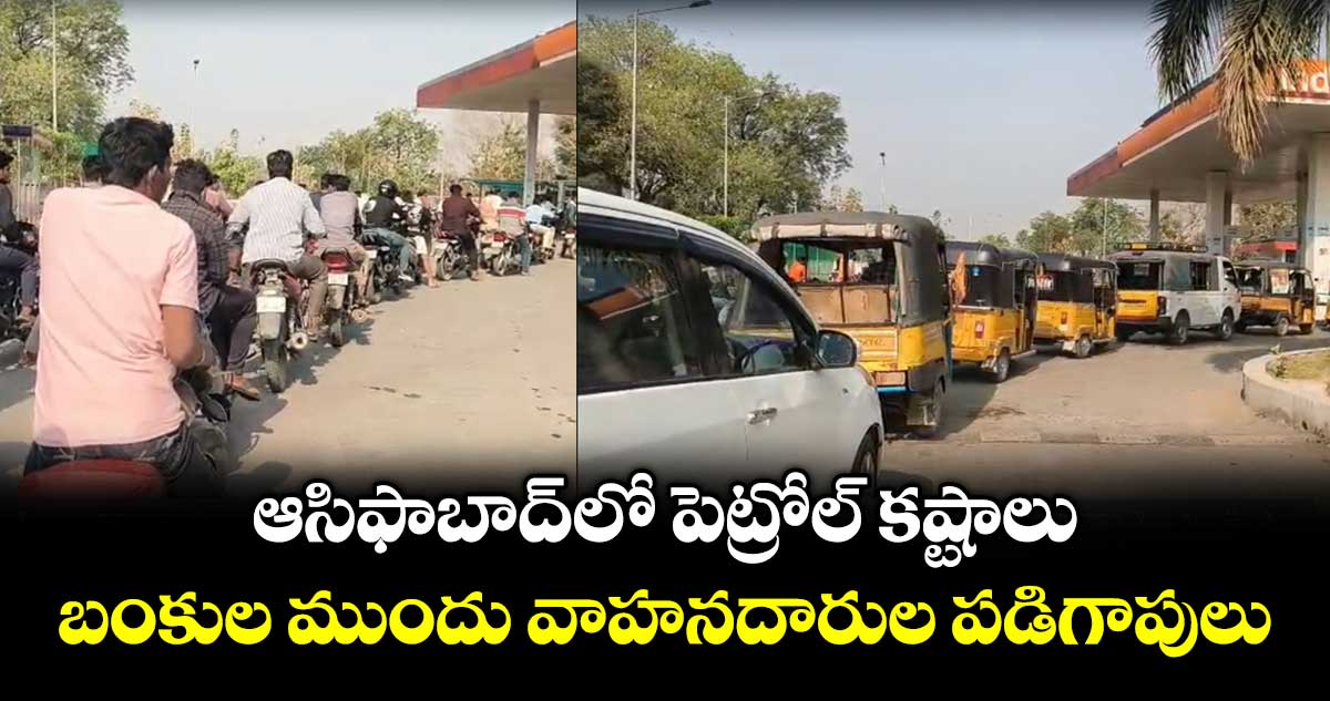 శుక్రవారం (మార్చి 13) ఆసిఫాబాద్ జిల్లా కేంద్రంలోని పెట్రోల్ బంకుల వద్ద వాహనదారులు పెద్ద సంఖ్యలో చేరారు. పెట్రోల్, డీజిల్ కోసం గంటల తరబడి క్యూలలో నిల్చుని వేచి చూడాల్సిన పరిస్థితి ఏర్పడింది. ఇంధన కొరత కారణంగా జిల్లా కేంద్రంలోని దాదాపు అన్ని పెట్రోల్ బంకులు మూసివేయబడ్డాయి. ఒకే ఒక బంక్ తెరిచి ఉండటంతో స్థానిక వాహనదారులంతా అక్కడికి చేరి భారీ క్యూలు కట్టారు.