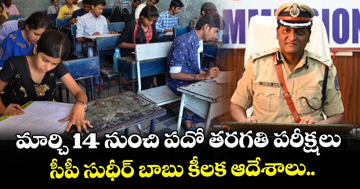 తెలంగాణలో పదో తరగతి పరీక్షలకు కౌంట్ డౌన్ స్టార్ట్ అయ్యింది. శనివారం ( మార్చి 14 ) నుంచి రాష్ట్రవ్యాప్తంగా పదో తరగతి పరీక్షలు ప్రారంభం కానున్నాయి. మార్చి 14 నుంచి ఏప్రిల్ 16 వరకు జరగనున్న ఈ పరీక్షల కోసం పోలీసులు అన్ని ఏర్పాట్లు పూర్తి చేశారు. ఈ క్రమంలో అధికారులకు కీలక ఆదేశాలు జారీ చేశారు సీపీ సుధీర్ బాబు. విద్యార్థులు ఎటువంటి ఇబ్బంది లేకుండా, ప్రశాంతంగా పరీక్షలు రాసేలా తగిన చర్యలు తీసుకోవాలని అధికారులను ఆదేశించారు.