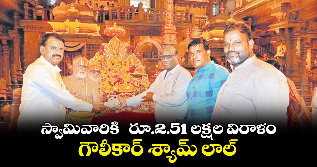 యాదగిరిగుట్ట, వెలుగు : శ్రీలక్ష్మీనరసింహస్వామి దేవస్థానానికి యాదగిరిగుట్టకు చెందిన భక్తుడు, మాజీ వార్డు సభ్యుడు గౌలీకార్ శ్యామ్ లాల్ తన తండ్రి గౌలీకార్ నర్సోజీ జ్ఞాపకార్థం రూ.2.51 లక్షలు విరాళంగా ఇచ్చారు. గురువారం ఫ్యామిలీ మెంబర్స్ గౌలీకార్ భానుప్రకాశ్, వేణుగోపాల్తో కలిసి ఆలయ ఏఈవో గజవెల్లి రఘు, అర్చకులు భాస్కరాచార్యులుకు నగదు అందజేశారు. ఈ సందర్భంగా ఆయన మాట్లాడుతూ అష్టోత్తర శతఘటాభిషేకంలో ఉపయోగించే ఆరు వెండి కలశాల కోసం ఈ విరాళాన్ని ఇచ్చినట్లు గౌలీకార్ శ్యామ్ లాల్ తెలిపారు. అనంతరం ఫ్యామిలీతో కలిసి స్వామివారిని దర్శించుకుని ప్రత్యేక పూజలు చేశారు.