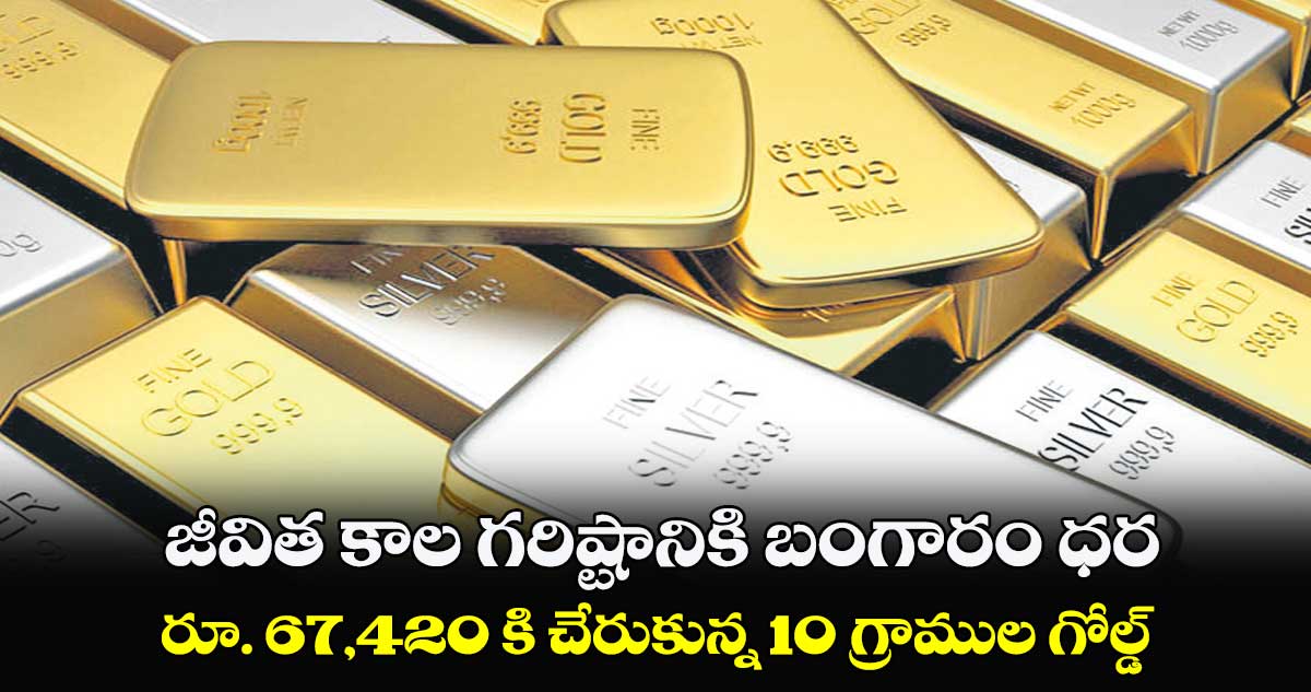 న్యూఢిల్లీ: గోల్డ్ ధరలు గురువారం ఆల్ టైమ్ గరిష్టాలను టచ్ చేశాయి. దేశ రాజధానిలో 10 గ్రాముల బంగారం రేటు రూ. 1,130 పెరిగి రూ.67,450 కి చేరుకుంది. గ్లోబల్గా రేట్లు పెరగడంతోనే మన దగ్గర కూడా పెరుగుతున్నాయని హెచ్డీఎఫ్సీ సెక్యూరిటీస్ ఓ స్టేట్మెంట్లో పేర్కొంది. పది గ్రాముల గోల్డ్ ధర బుధవారం సెషన్లో రూ.66,320 దగ్గర ముగిసింది. కేజీ సిల్వర్ రేటు రూ.1,100 పెరిగి రూ.77,750 కి చేరుకుంది.