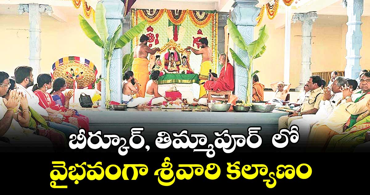 బీర్కూర్, వెలుగు : మండలంలోని బీర్కూర్, తిమ్మాపూర్ గ్రామాల శివారులోని తెలంగాణ తిరుమల ఆలయంలో గురువారం శ్రీదేవి, భూదేవి సమేత వేంకటేశ్వర స్వామి కల్యాణం వైభవంగా జరిగింది. దేవనాధ రామానుజ జీయర్ స్వామి ఆధ్వర్యంలో జరిగిన ఉత్సవాల్లో ఎమ్మెల్యే పోచారం శ్రీనివాస్ రెడ్డి, పుష్ప దంపతులు, కుటుంబీకులు పాల్గొన్నారు. అనంతరం మాడవీధుల్లో హనుమ వాహనంపై స్వామివారిని ఊరేగించారు.