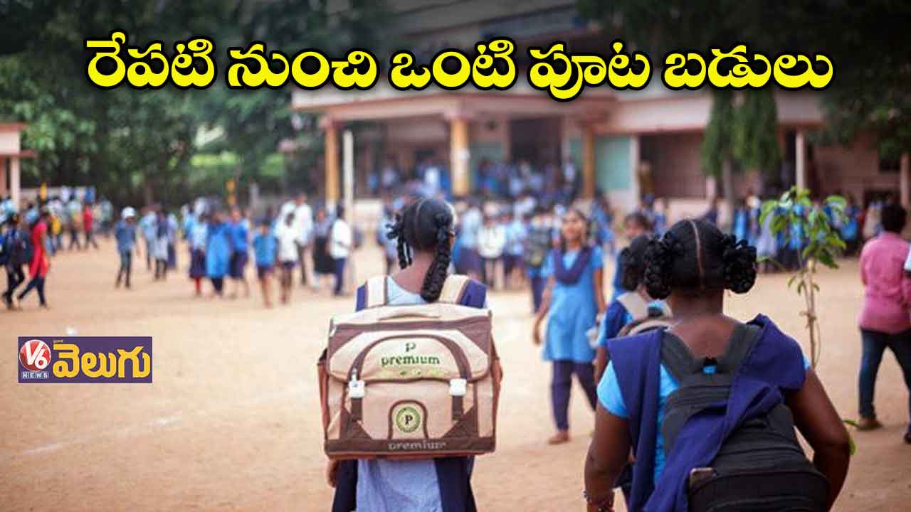 రాష్ట్రంలో రేపటి (మార్చి 15) నుంచి ఒంటి పూట బడులు ప్రారంభం కానున్నాయి. ఈ మేరకు రాష్ట్ర విద్యా శాఖ ఉత్తర్వులు జారీ చేసింది. ప్రభుత్వ పాఠశాలలతో పాటు ప్రైవేట్ విద్యా సంస్థలు కూడా రేపటి నుంచి ఒంటి పూట బడుల నిర్వహించాలని ఆదేశించింది. ఉదయం 8 గంటల నుంచి మధ్యాహ్నం 12.30 వరకు క్లాసులు జరుగుతాయని విద్యా శాఖ జీవోలో పేర్కొంది. మధ్యాహ్నం క్లాసులు ముగిసిన తర్వాత యథావిధిగా మిడ్ డే మీల్స్ కొనసాగించాలని ఆదేశించింది. మధ్యాహ్నం 12.30 గంటలకు మధ్యాహ్న భోజనం పెట్టిన తర్వాత పిల్లలను ఇంటికి పంపాలని సూచించింది. అయితే పదో తరగతి విద్యార్థులకు మాత్రం ప్రిపరేషన్ కోసం స్పెషల్ క్లాసులు కొనసాగించాల స్కూల్ ఎడ్యుకేషన్ డైరెక్టర్ దేవసేన ఉత్తర్వుల్లో పేర్కొన్నారు.