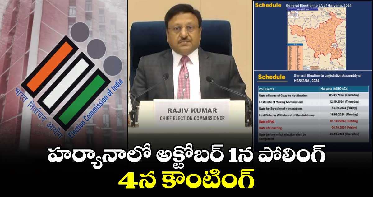 హర్యానాలో ఎన్నికల నగారా మోగింది. అసెంబ్లీ ఎన్నికల షెడ్యూల్ ను ప్రకటించింది సీఈసీ. హరియాణాలో 90 స్థానాలకు ఒకే విడతలో పోలింగ్ జరగనున్నట్లు సీఈసీ రాజీవ్ కుమార్ వెల్లడించారు. అక్టోబర్ 1న హర్యానా అసెంబ్లీ ఎన్నికలు జరగనుండగా..అక్టోబర్ 4న కౌంటింగ్ జరగనుంది.