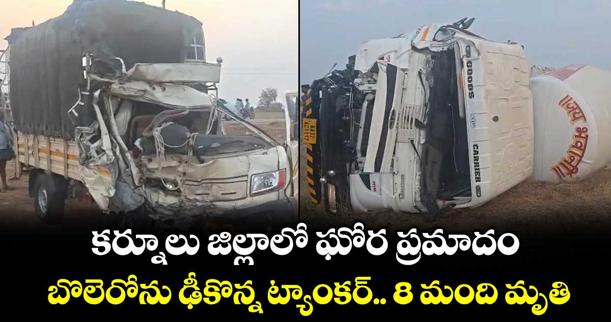 కర్నూలు జిల్లాలో ఘోర రోడ్డు ప్రుమాదం జరిగింది. బొలెరోను ట్యాంకర్ ఢీ కొట్టడంతో స్పాట్ లోనే 8 మంది చనిపోయారు. మరో 10 మందికి తీవ్ర గాయాలయ్యాయి. 2026 ఏప్రిల్ 16న తెల్లవారుజామున మంత్రాలయం మండలం చిలకలడోన సమీపంలో ఈ ఘోర ప్రమాదం చోటు చేసుకుంది.