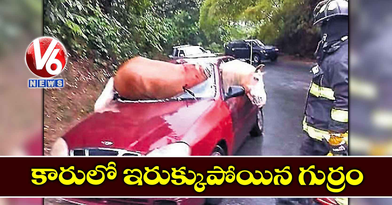 హైవే మీద ఓ కారు దూసుకుపోతోంది. ఇంతలో ఎక్కడి నుంచి వచ్చిందో, ఎట్లొచ్చిందోగానీ సడన్గా రోడ్డుపైకి వచ్చింది ఓ గుర్రం. ఆ గుర్రాన్ని చూసి కారు డ్రైవర్ బ్రేకేశాడు. కానీ, కంట్రోల్ కాలేదు. గుర్రాన్ని ఢీకొట్టేసింది. ఆ ఫోర్స్కు కారు ముందు అద్దం పగిలి ఆ గుర్రం ముందు రెండు కాళ్లు, మొహం కారులో ఇరుక్కుపోయాయి. అప్పటికే పగిలిన అద్దం ముక్కల వల్ల గుర్రానికి గాయాలయ్యాయి. ముందు డోరు విండో నుంచి తల బయటకు పెట్టి బయటపడే ప్రయత్నం చేసినా కుదరలేదు. దీంతో అధికారులు వచ్చి ఆ కారు టాప్ను కోసేసి గుర్రాన్ని బయటకు తీశారు. అదృష్టవశాత్తూ కారు డ్రైవర్కు ఏం కాలేదు. గుర్రానికే అద్దం ముక్కలు కోసుకుపోయాయి. ఆ గుర్రం పేరు రాంచెరో. ఆ గుర్రం ఓనర్ మాషితో స్వింగ్.ఈ ఘటన పోర్టోరికోలోని గ్వేడనోలో జరిగింది. తన గుర్రం వల్ల కారు మొత్తం పాడైపోవడంతో ఆ కారు ఓనర్కు డబ్బులు ఇచ్చాడు మాషితో. అయితే, తన గుర్రం ట్రీట్మెంట్కు డబ్బులు లేకపోవడంతో క్రౌడ్ఫండింగ్ కోసం రిక్వెస్ట్ పెట్టాడు. దీంతో చాలా మంది నెటిజన్లు ఆ గుర్రం బాధ చూసి డబ్బులు పోగేసి ఇస్తున్నారు.